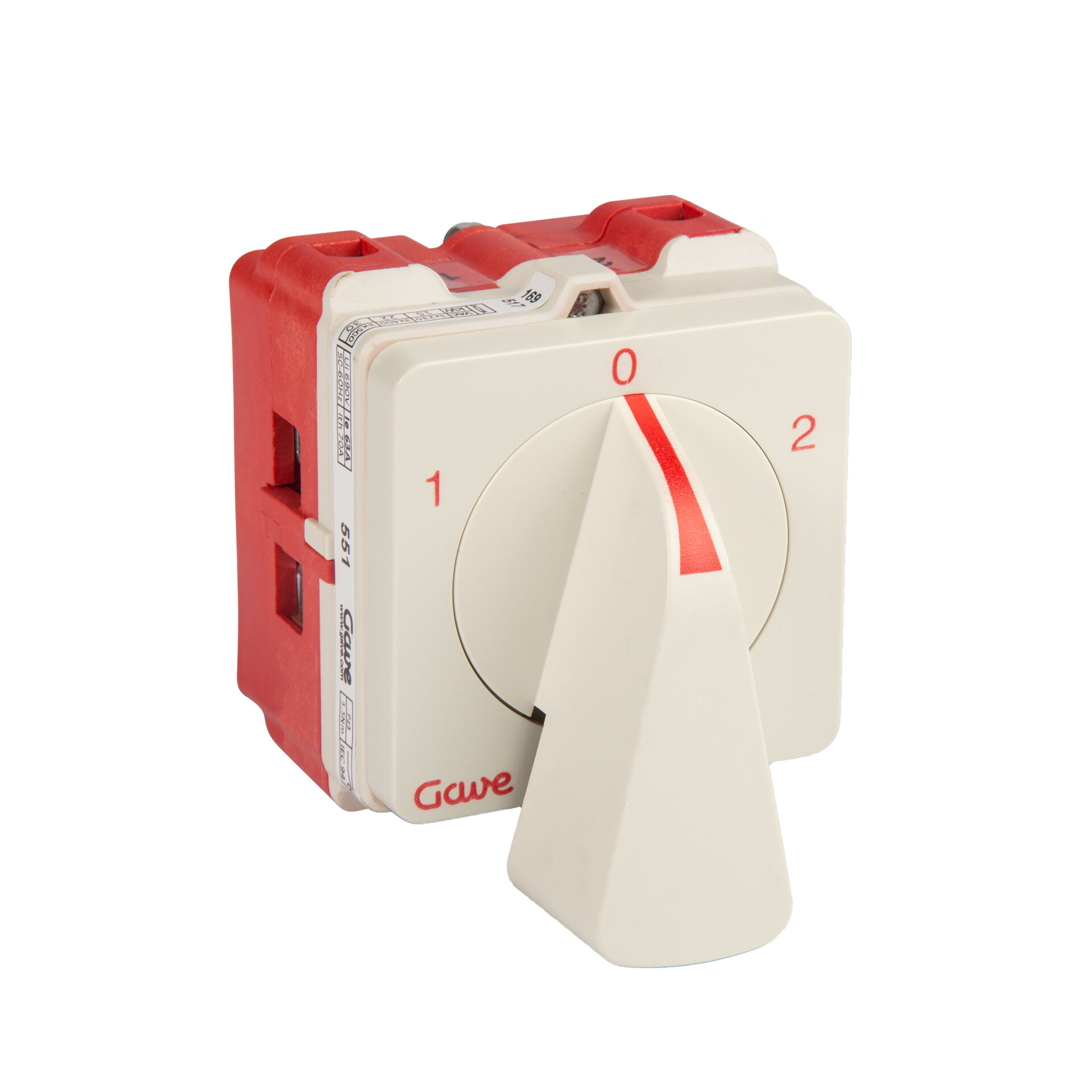 Changeover cam switch, IP20 with 1-0-2 grey front plate 64x64 for panel fixing. 1 pole 63A. Size D2. Ergonomic screwless quick-mount handle. Connection with cage terminals for 16-50 mm² cable. Compatible with multiple accessories from the A5 series.