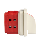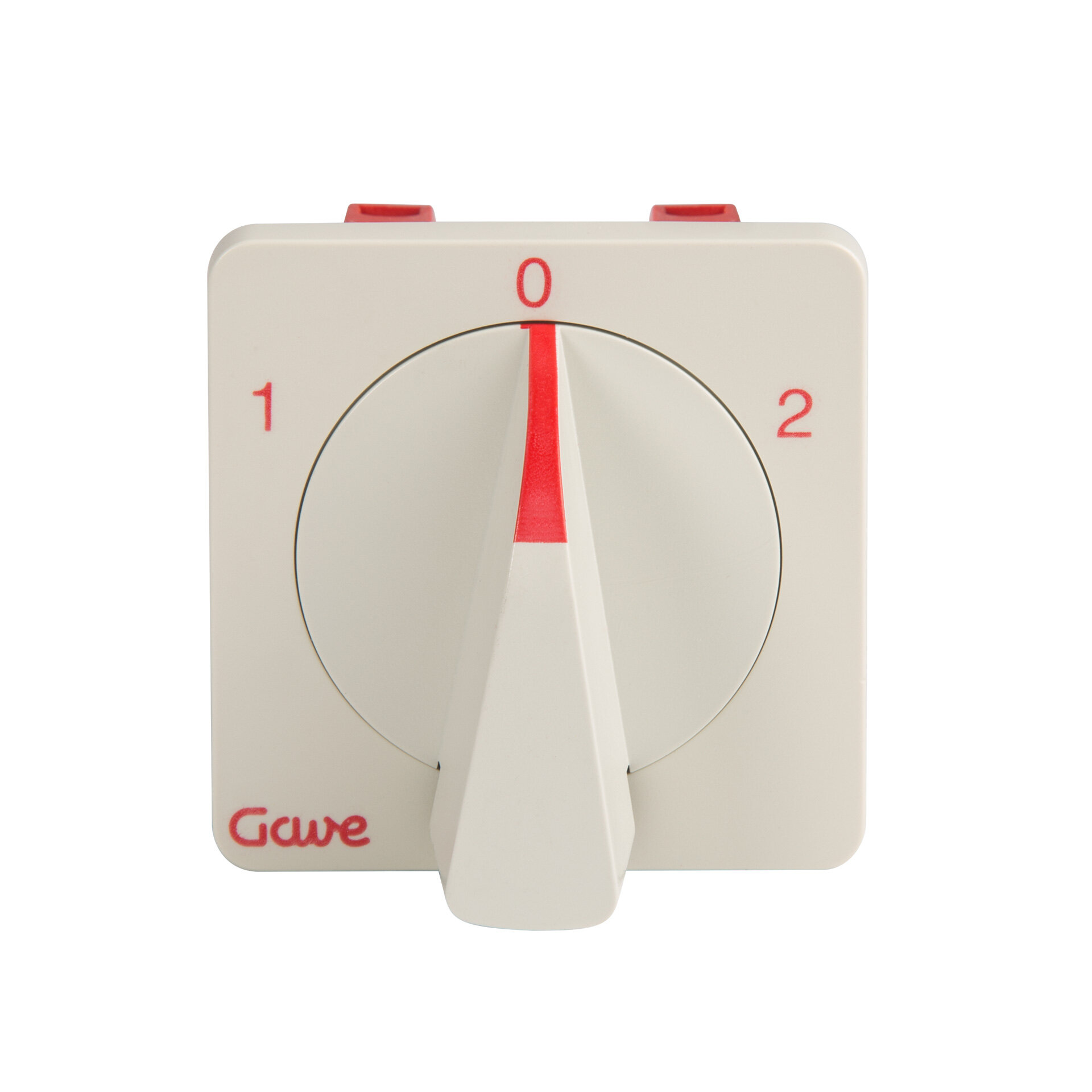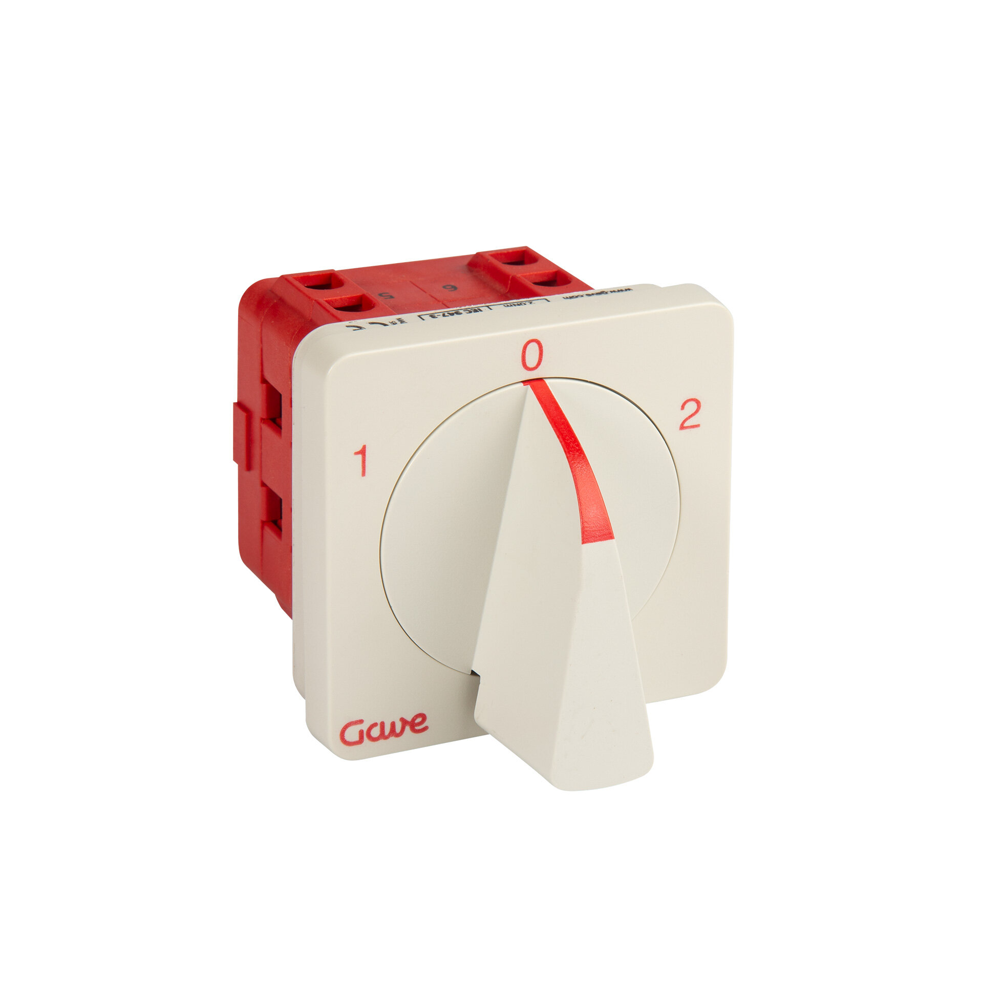 Changeover cam switch, IP20 with 1-0-2 grey front plate 64x64 for panel fixing. 2 poles 32A. Size D1. Ergonomic screwless quick-mount handle. Connection with cage terminals for 6-16 mm² cable. Compatible with multiple accessories from the A5 series.