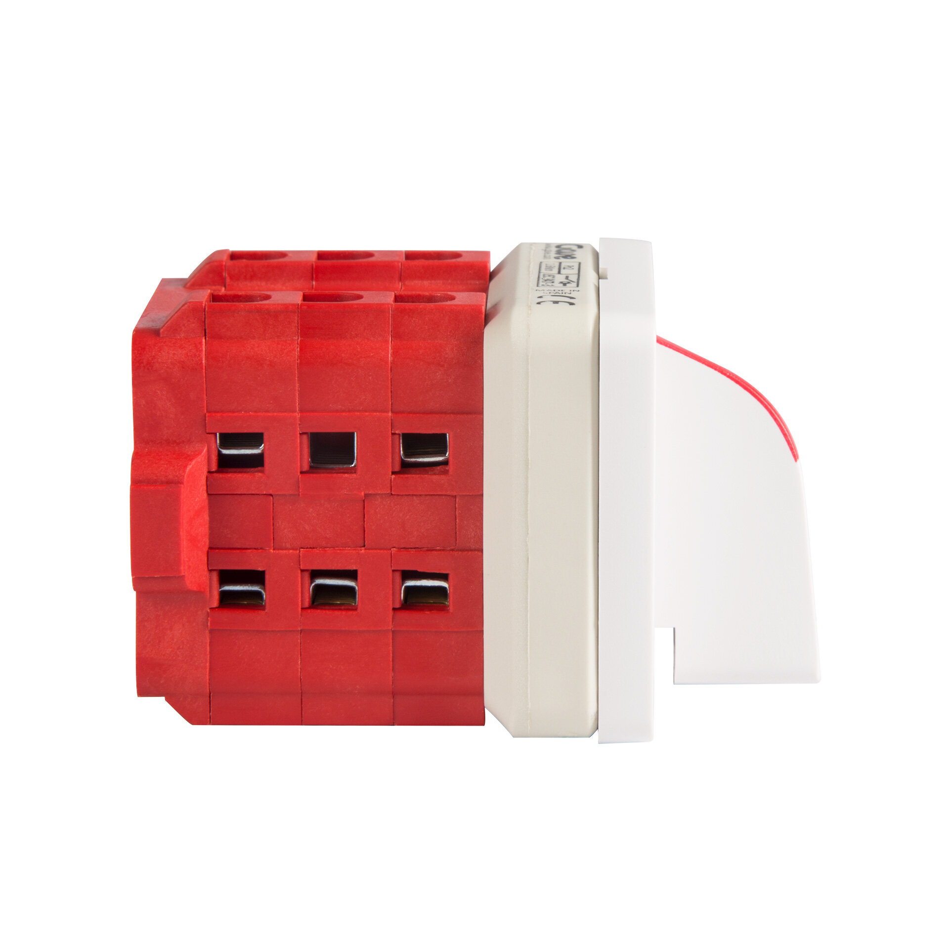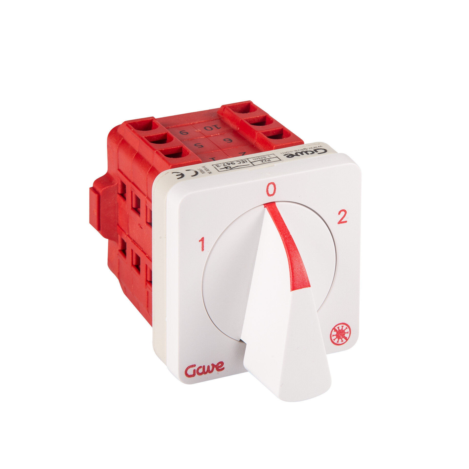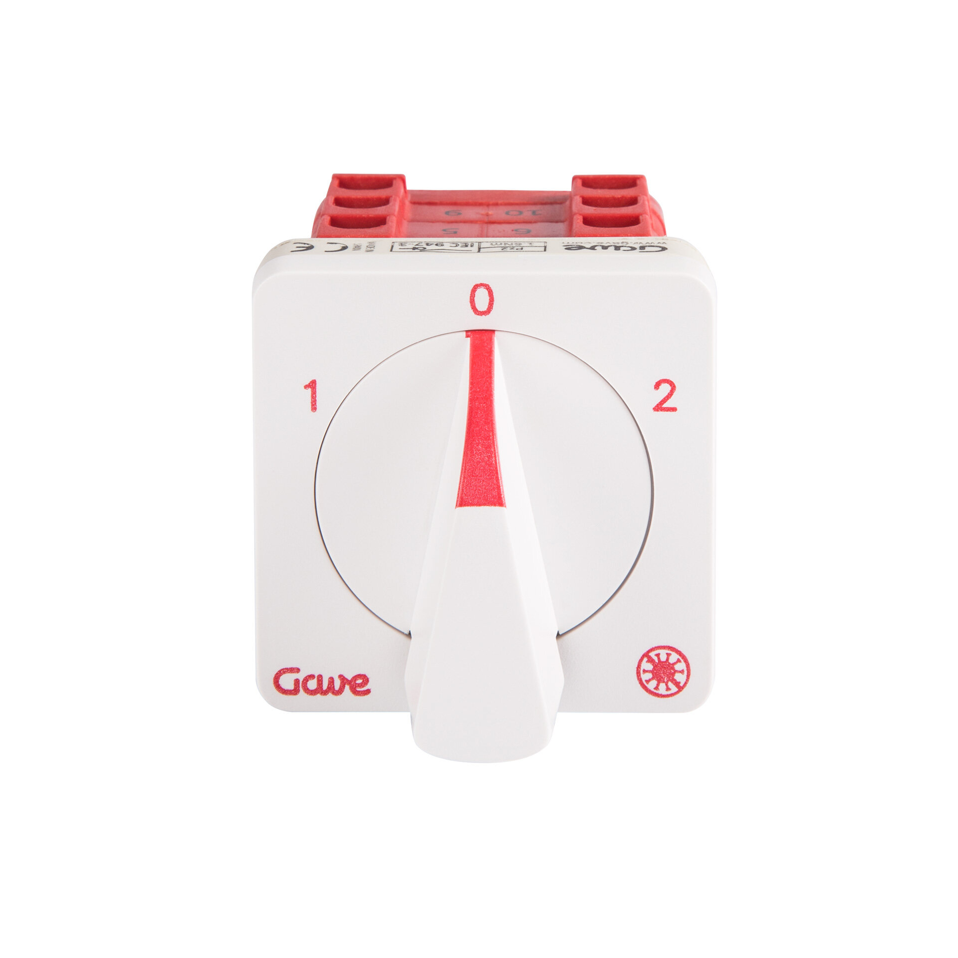 Changeover switch IP20. Kit of 1-0-2 front plate with antimicrobial treatment White color RAL 9010 48x48 for panel fixing. 3 poloss 12A. Size D0. Ergonomic screwless quick-mount handle. Connection with cage terminals for 2.5-6 mm² cable. Compatible with multiple accessories from the A5 series.