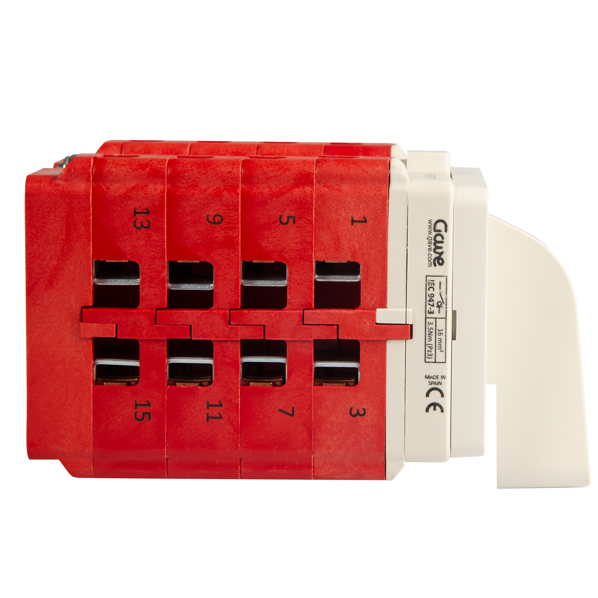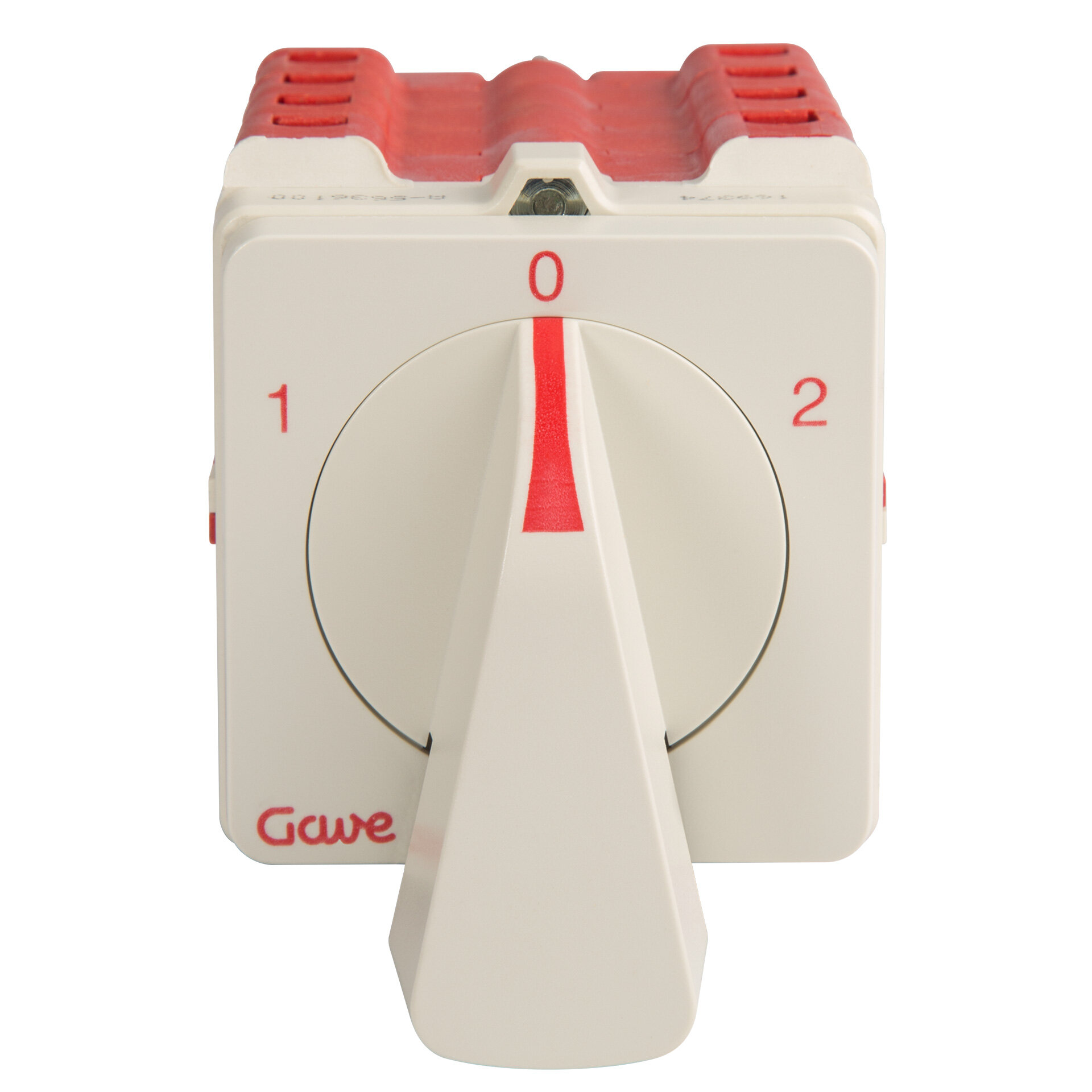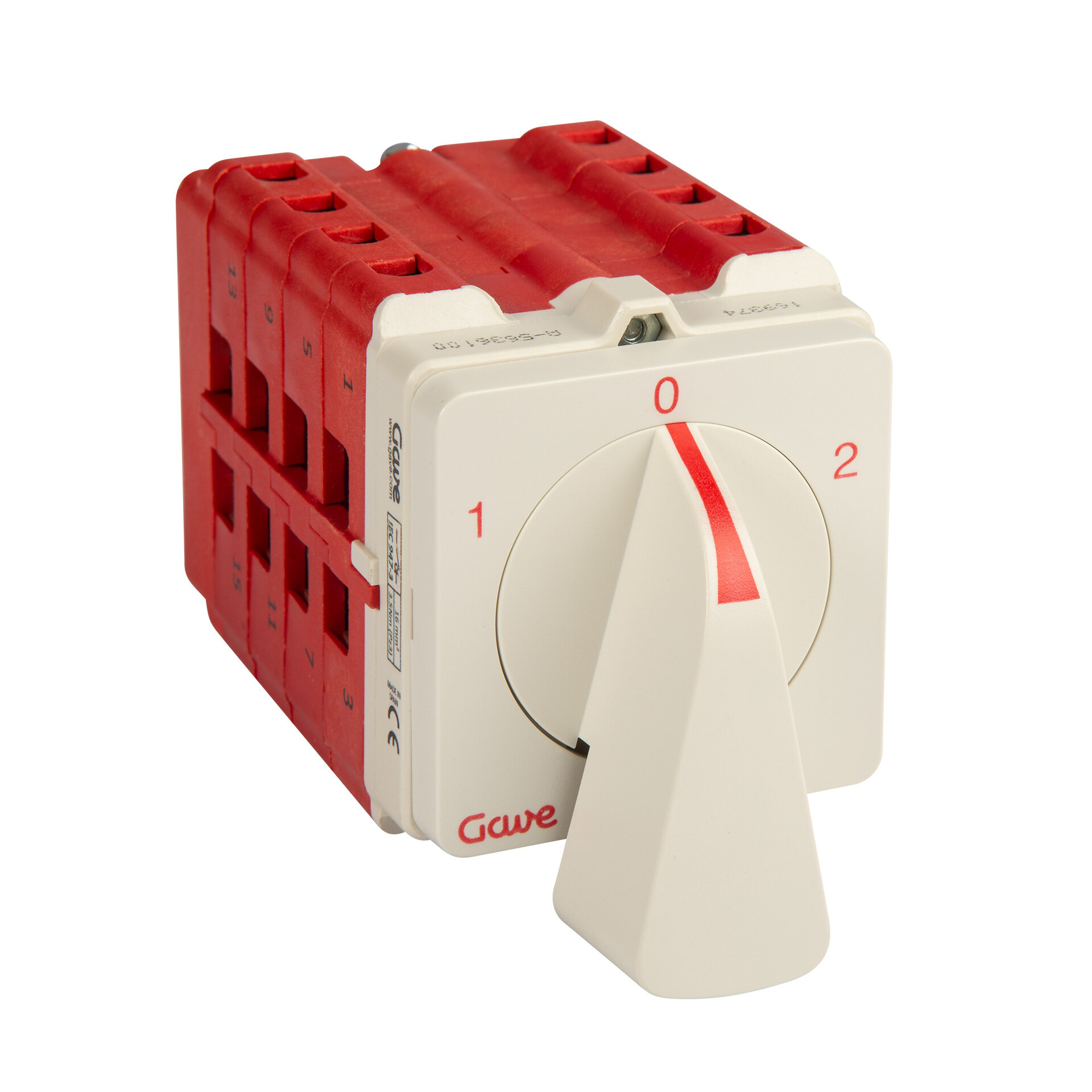 Changeover cam switch, IP20 with 1-0-2 grey front plate 64x64 for panel fixing. 4 poles 63A. Size D2. Ergonomic screwless quick-mount handle. Connection with cage terminals for 16-50 mm² cable. Compatible with multiple accessories from the A5 series.