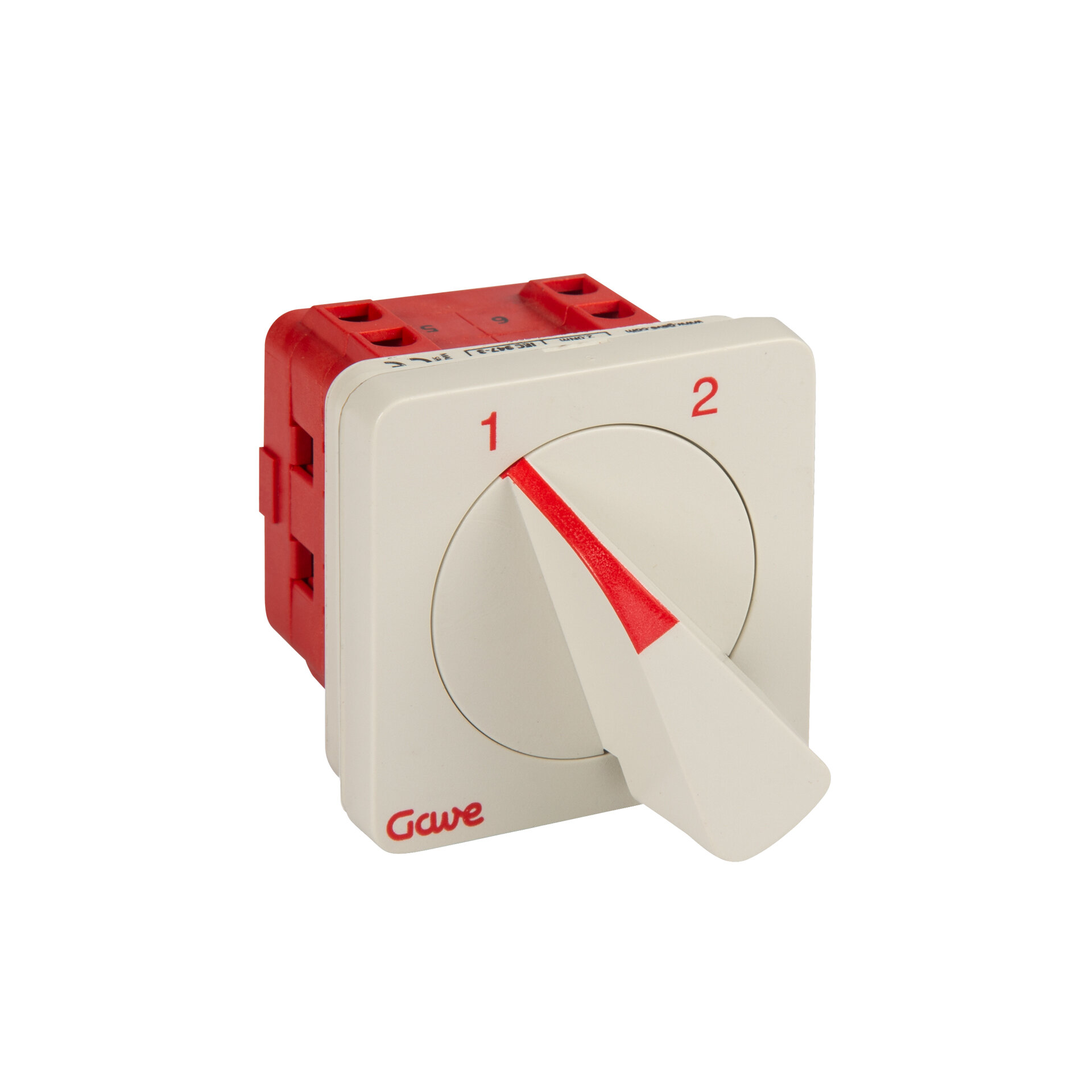 Changeover cam switch, IP20 with 1-2 grey front plate 64x64 for panel fixing. 3 poles 40A. Size D1. Ergonomic screwless quick-mount handle. Connection with cage terminals for 6-16 mm² cable. Compatible with multiple accessories from the A5 series.