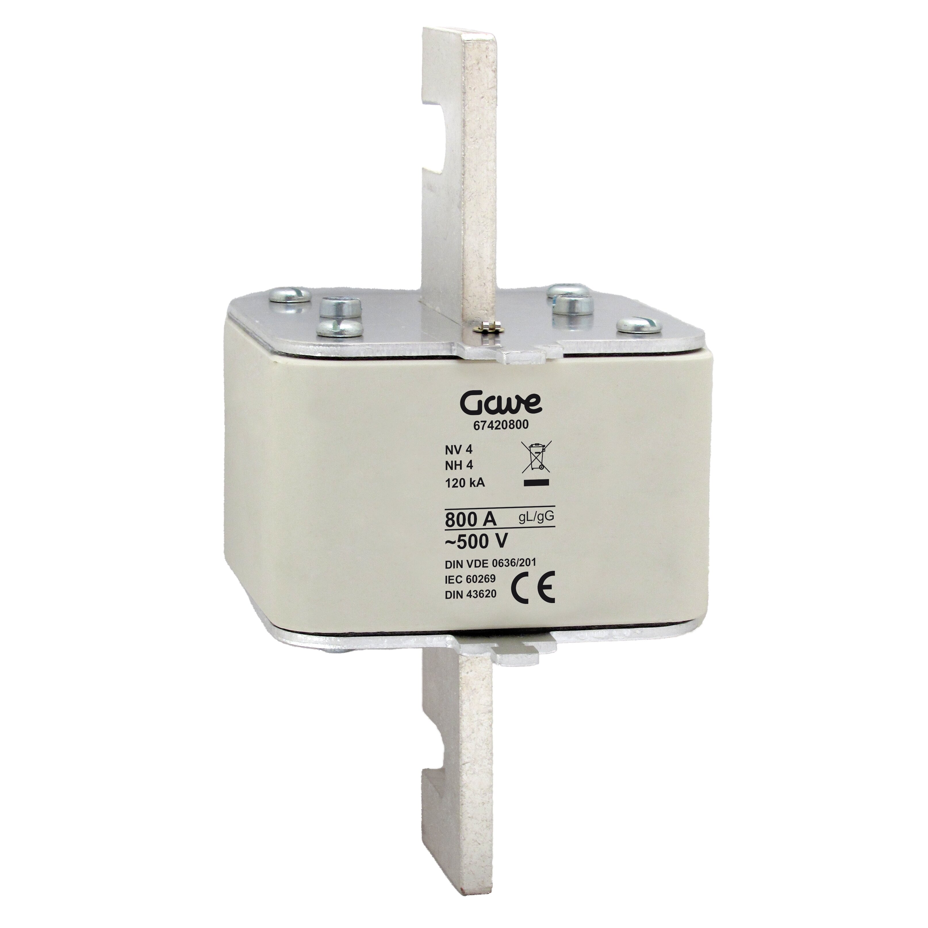 NH blade fuse size 4 Nominal current of 800A with GG class protection curve. Suitable for the protection of lines or equipment for tensions up to 500V offers a high selectivity in the protection against overload and a 120KA rupture capacity in short-circuit protection. Ceramic highly resistant to thermal shocks and pressure. Contacts in copper with silver bath and specially for easy introduction to the fuse and incoming base for fixing the screws.