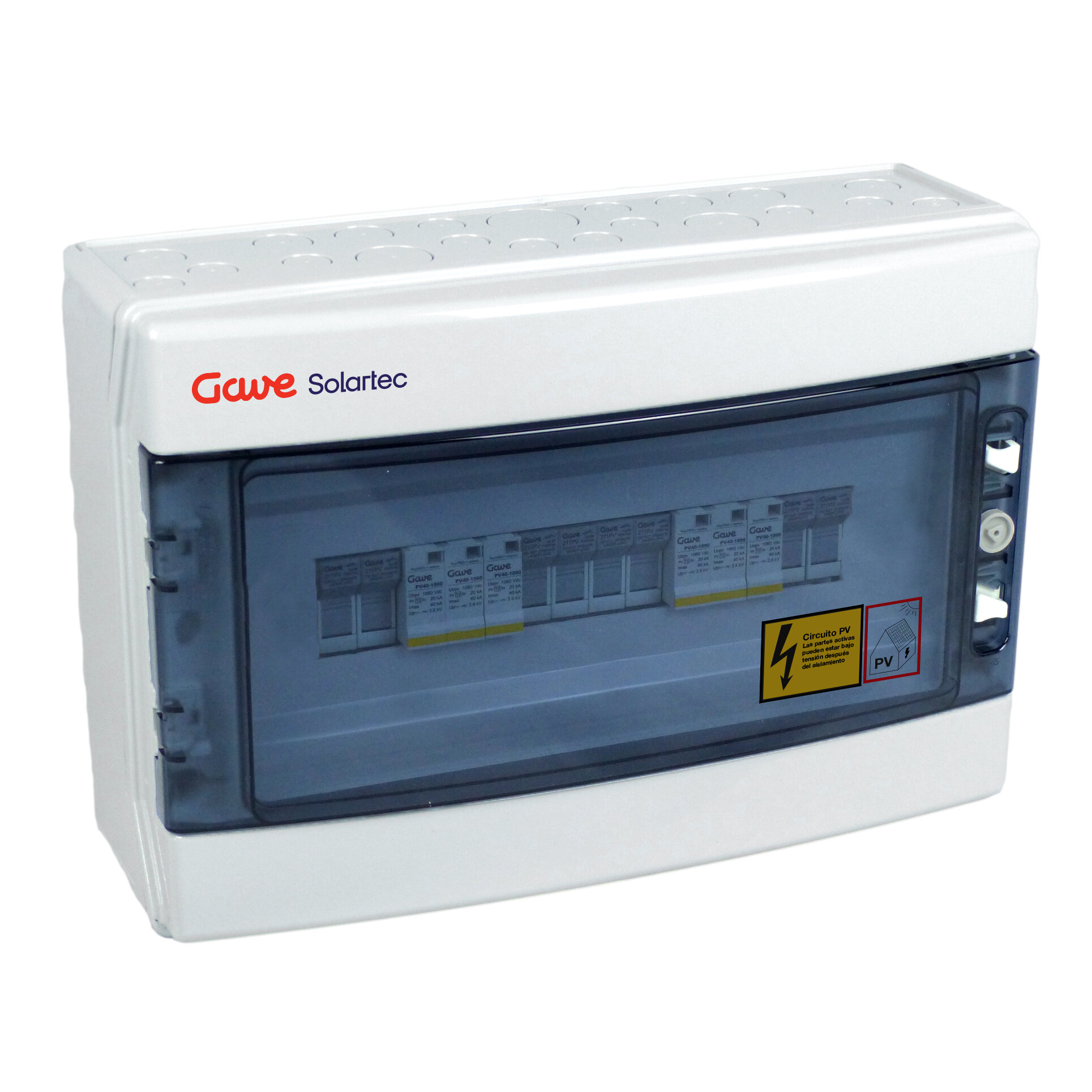 PV surge protection box 2MPPT, 2 strings independent circuits x mppt (4 input, 4 output) fuseholder and fuse 12A gPV + surge protectors class II maximum voltage 1000Vdc, for safe installations. Double insulation class II polycarbonate box suitable for outdoor use with high impact protection (IK08). Dimensions 286x418x148mm.