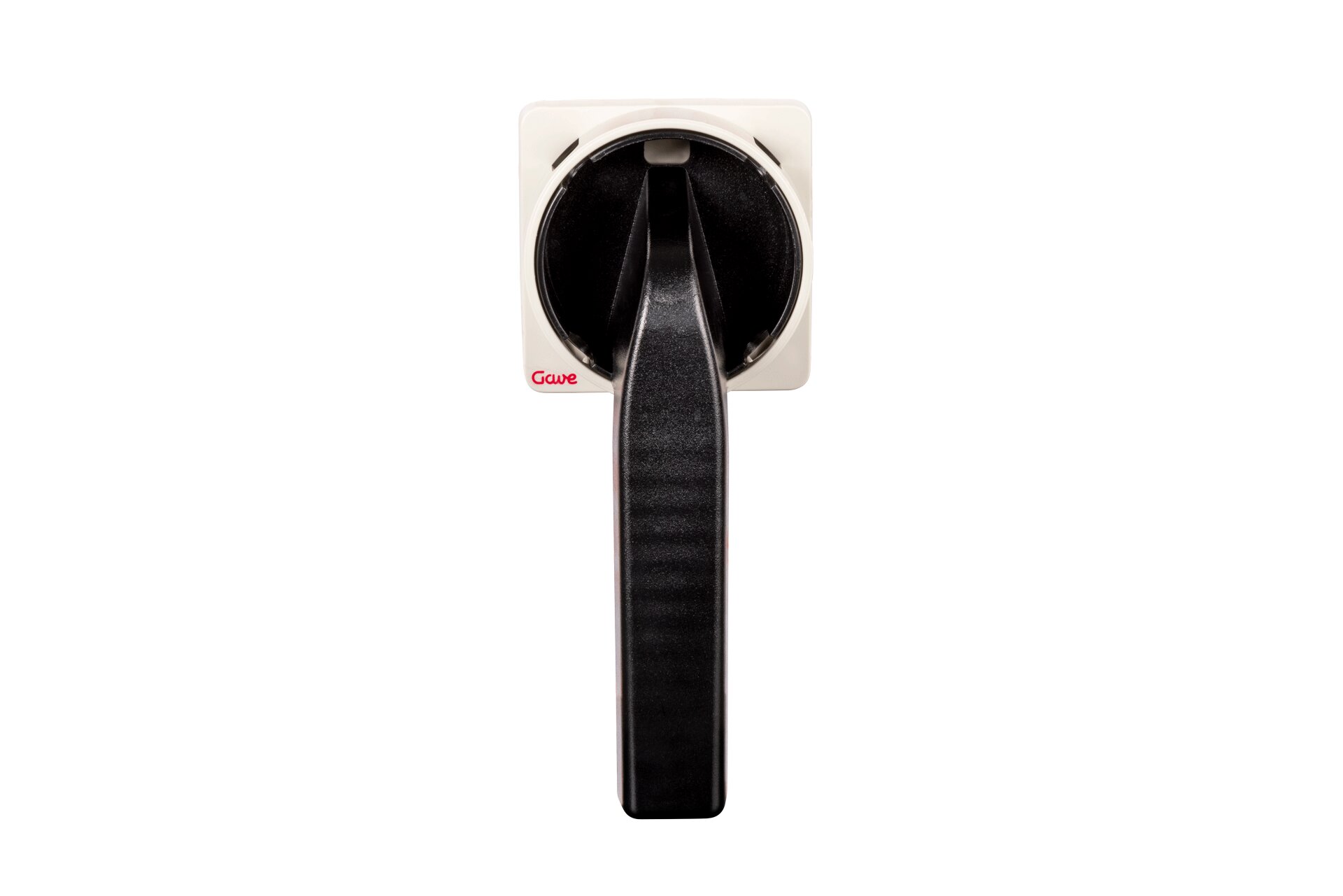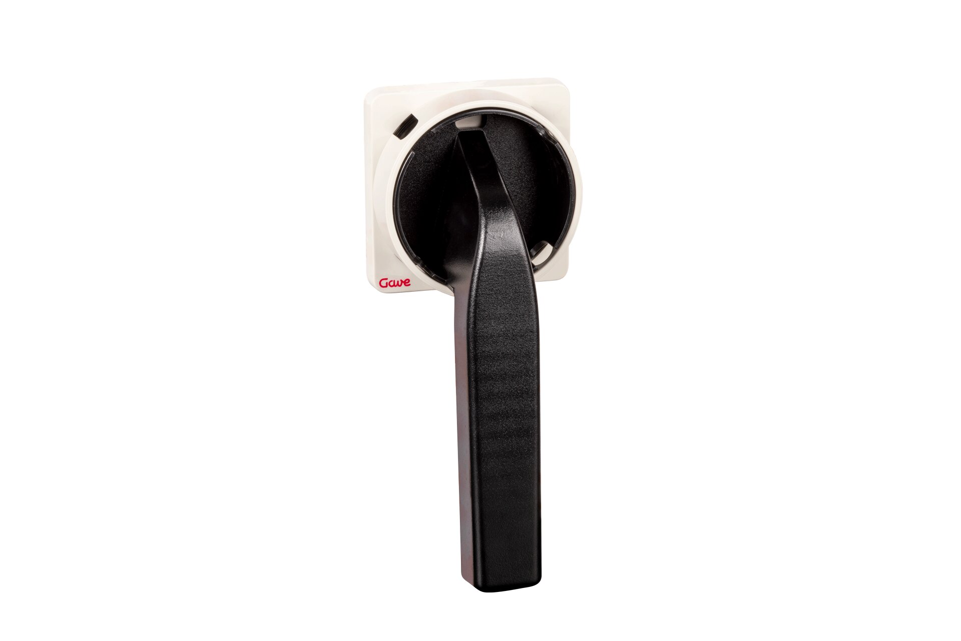 Handle set with 64x64 grey plate with circular ring with 4 holes to use for padlocks up to 8mm diammeter and ergonomic lever handle in black color with a circular ring with 4 indent that match with the plate holes on the locking positions. For size D2/D3. Also includes fixing plate and stickers to be use based on which switch will be associated
