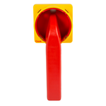 Handle set with 64x64 yellow plate with circular ring with 4 holes to use for padlocks up to 8mm diammeter and ergonomic lever handle in red color with a circular ring with 4 indent that match with the plate holes on the locking positions. For size D2/D3. Also includes fixing plate and stickers to be use based on which switch will be associated