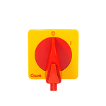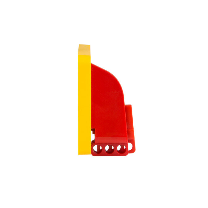 Handle set consisting of a yellow cover plate 48x48 with an ergonomic red handle fitted with a pushbutton to lockout the handle with up to 3 padlocks of maximum 4mm diammeter. For devices size 0. Lockable only in position 0.