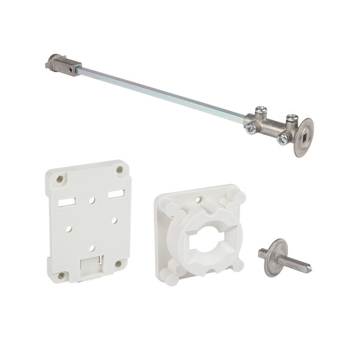 Set of interlockable clutch and metal shaft 5mm square for A5 series switches size D0/D1, length 200mm and DIN rail fixing plate.