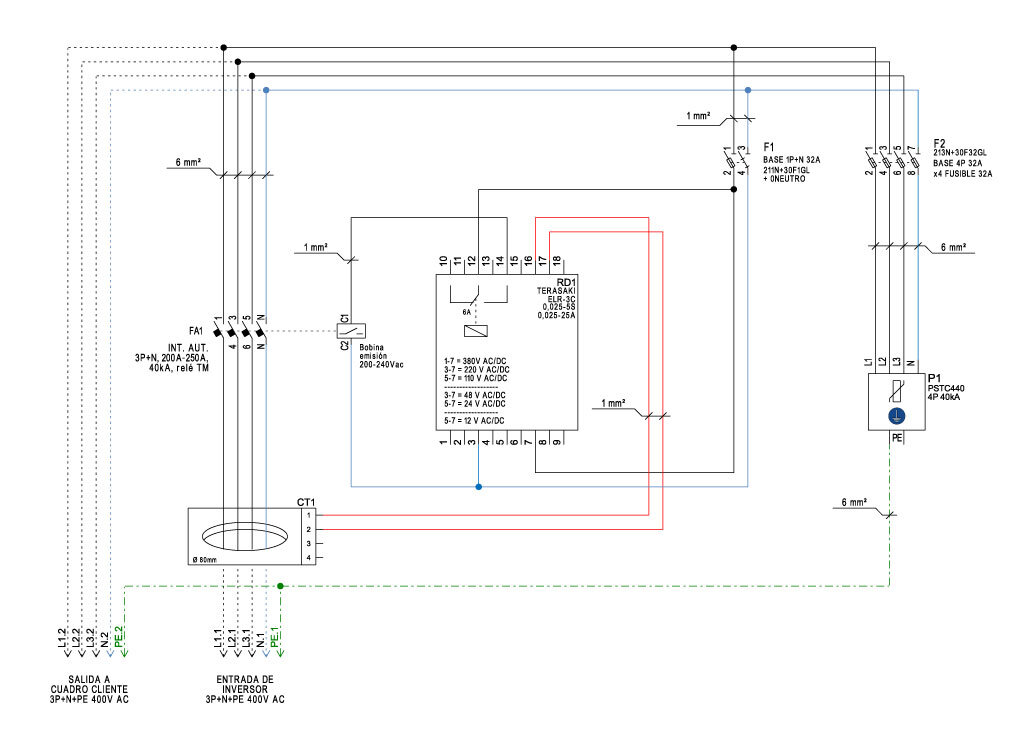Armario de conexión 400V AC 3P+N para salida de un inversor trifásico hasta 200A con protección automática, diferencial y sobretensiones. Interruptor automático 3P+N 200A con relé TM regulable 40kA (400Vac) según IEC 60947-2. Protección diferencial mediante relé con sensibilidad y temporización regulable. Transformador diferencial circular diámetro 80mm. Protector de sobretensiones Clase II In 20kA Imax 40kA Up 1,5kV UNE-EN 61643-11 con protección fusible asociada. Armario de fijación mural en acero laminado, color RAL 7035, grado de protección IP66, resistencia a los impactos IK10. Dimensiones 600x500x250mm. Pletinas de conexión de ancho 25 mm.