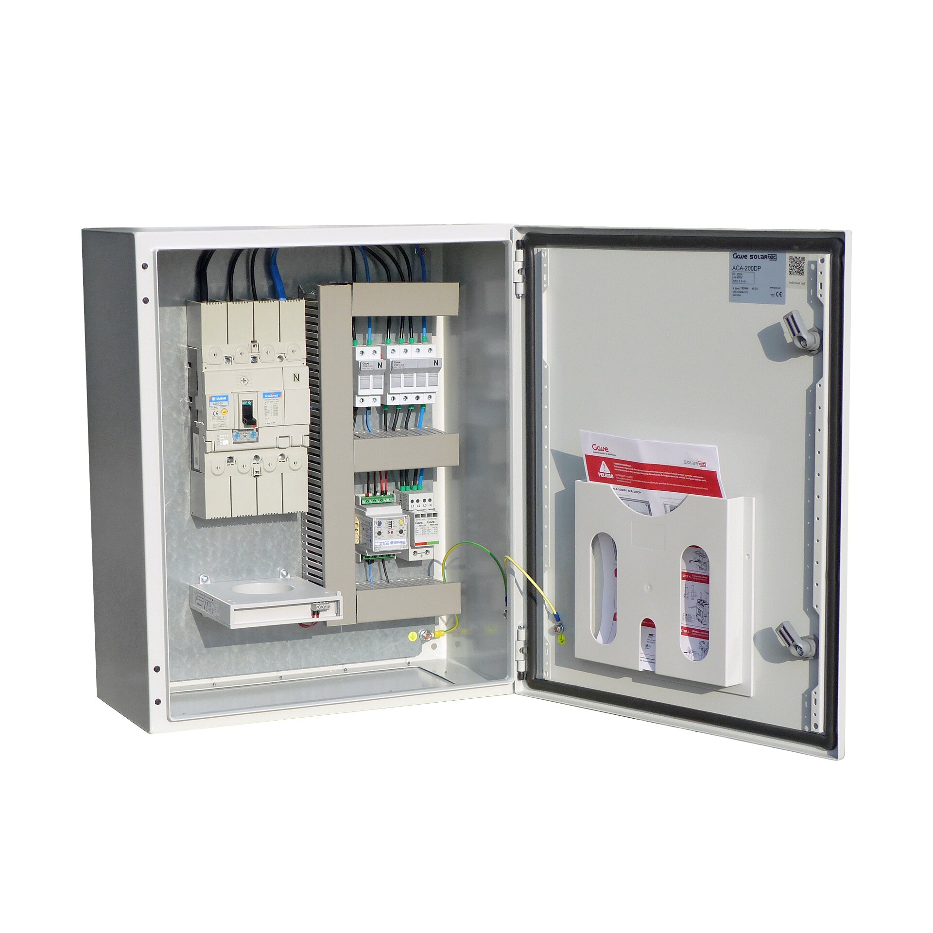 Armario de conexión 400 V AC 3P+N para salida de inversor trifásico hasta 250A con protección automática, diferencial y sobretensiones. Interruptor automático 3P+N 250 A, poder de corte 40 kA (400Vac), según IEC 60947-2, relé TM regulable. Protección diferencial modular tipo A con sensibilidad y temporización regulable. Transformador diferencial circular diámetro 110 mm. Protector de sobretensiones Clase II In 20kA Imax 40kA Up 1,5kV UNE-EN 61643-11 con protección fusible asociada. Armario de fijación mural en acero laminado, color RAL 7035 y grado de protección IP66, resistencia a los impactos IK10. Dimensiones 600x500x250mm.