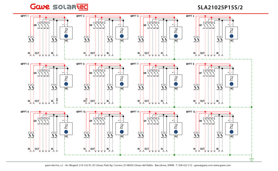 Armario conexión PV para 12MPPT, 2 strings independientes x mppt (24 entradas, 24 salidas) base y fusible 15A gPV + seccionadores 2 circuitos 25A + protectores sobretensión clase II tensión máxima de 1000Vdc, para realizar instalaciones con toda seguridad. Armario en poliéster reforzado en fibra de vidrio autoextingible color gris RAL7035 con puerta de 180º de apertura de cierre de doble barra. Elevado nivel de protección contra los elementos exteriores IP66 y resistencia a los impactos IK10. Parte inferior de la caja con prensaestopas. Dimensiones de 1000x800x300.