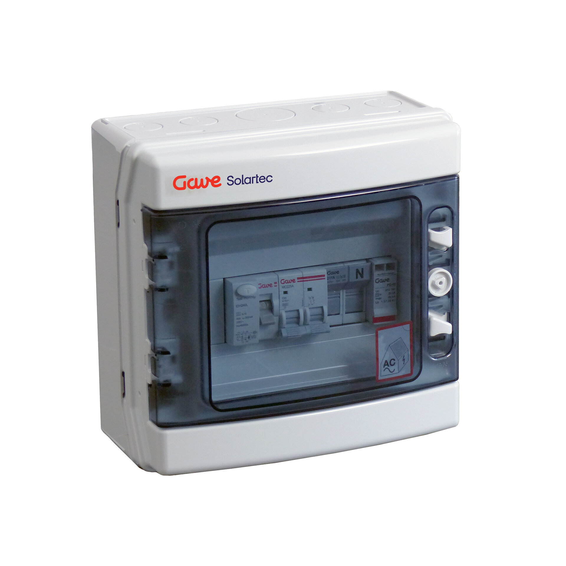 Caja modular de conexión equipada con protección automático, diferencial y sobretensiones. Interruptor automático bipolar 16A curva C poder de corte 6kA - UNE-EN 60898-1. Interruptor diferencial bipolar tipo A sensibilidad 300mA para corrientes alternas con componentes de contínua, protegido contra disparos intempestivos 0,25kA, UNE-EN 61008-1. Protector de sobretensiones Clase II In 20kA Imax 40kA Up 1,5kV UNE-EN 61643-11 con protección fusible asociada. Caja en policarbonato de doble aislamiento clase II apto para uso exterior con una elevada resistencia a los golpes (IK08). Dimensiones de 231x238x118mm