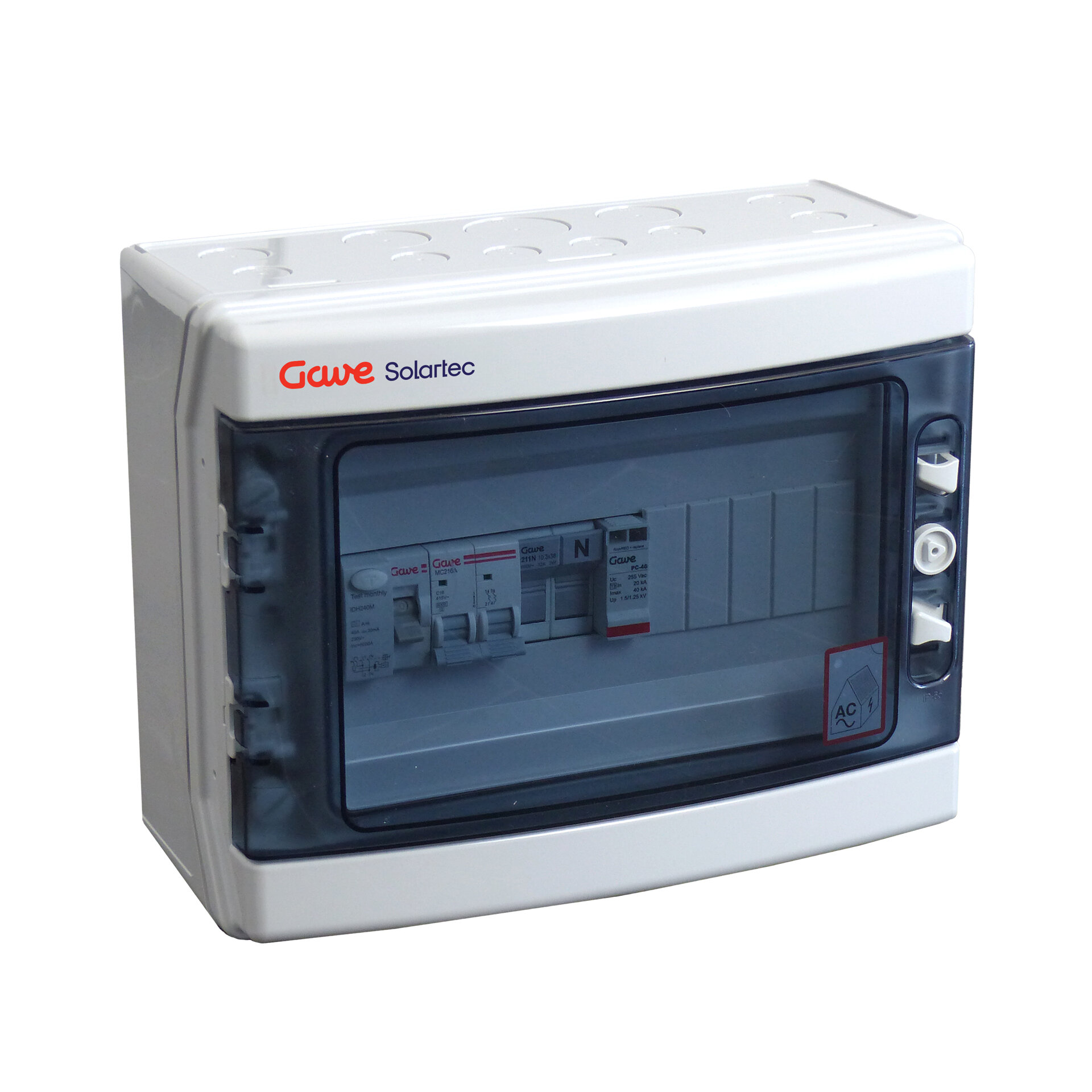 Caja modular de conexión equipada con protección automático, diferencial y sobretensiones. Interruptor automático bipolar 20A curva C poder de corte 6kA - UNE-EN 60898-1. Interruptor diferencial bipolar tipo A sensibilidad 30mA para corrientes alternas con componentes de contínua, protegido contra disparos intempestivos 0,25kA, UNE-EN 61008-1. Protector de sobretensiones Clase II In 20kA Imax 40kA Up 1,5kV UNE-EN 61643-11 con protección fusible asociada. Caja en policarbonato de doble aislamiento clase II apto para uso exterior con una elevada resistencia a los golpes (IK08). Espacio de 5 módulos disponible para incorporar aparellaje. Dimensiones de 246x310x148 mm