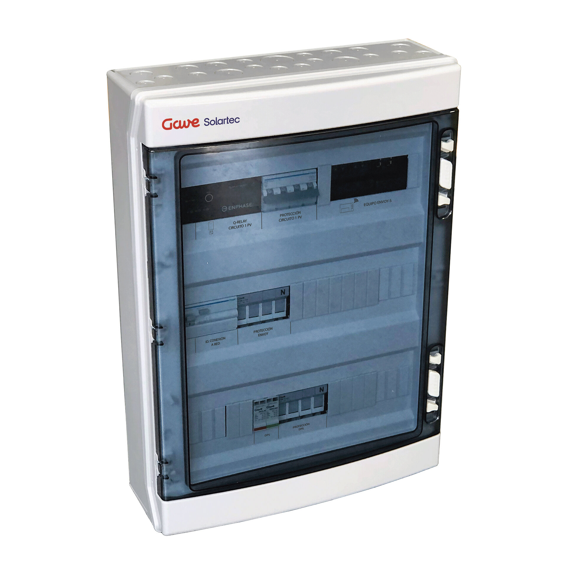 Caja modular de conexión trifásica para 1 circuito trifásico, equipada con protección automática, diferencial y solución Enphase. Interruptor automático tetrapolar 20A curva C poder de corte 6kA - UNE-EN 60898-1. Interruptor diferencial bipolar tipo A sensibilidad 30mA para corrientes alternas con componentes de continua, protegido contra disparos intempestivos 0,25kA, UNE-EN 61008-1. Relé de control Enphase para evitar los desequilibrios en la red. Medidor de producción y consumo Enphase con protección fusible asociada. Caja en policarbonato de doble aislamiento clase II apto para uso exterior con una elevada resistencia a los impactos (IK08). Dimensiones de 586x418x148mm.