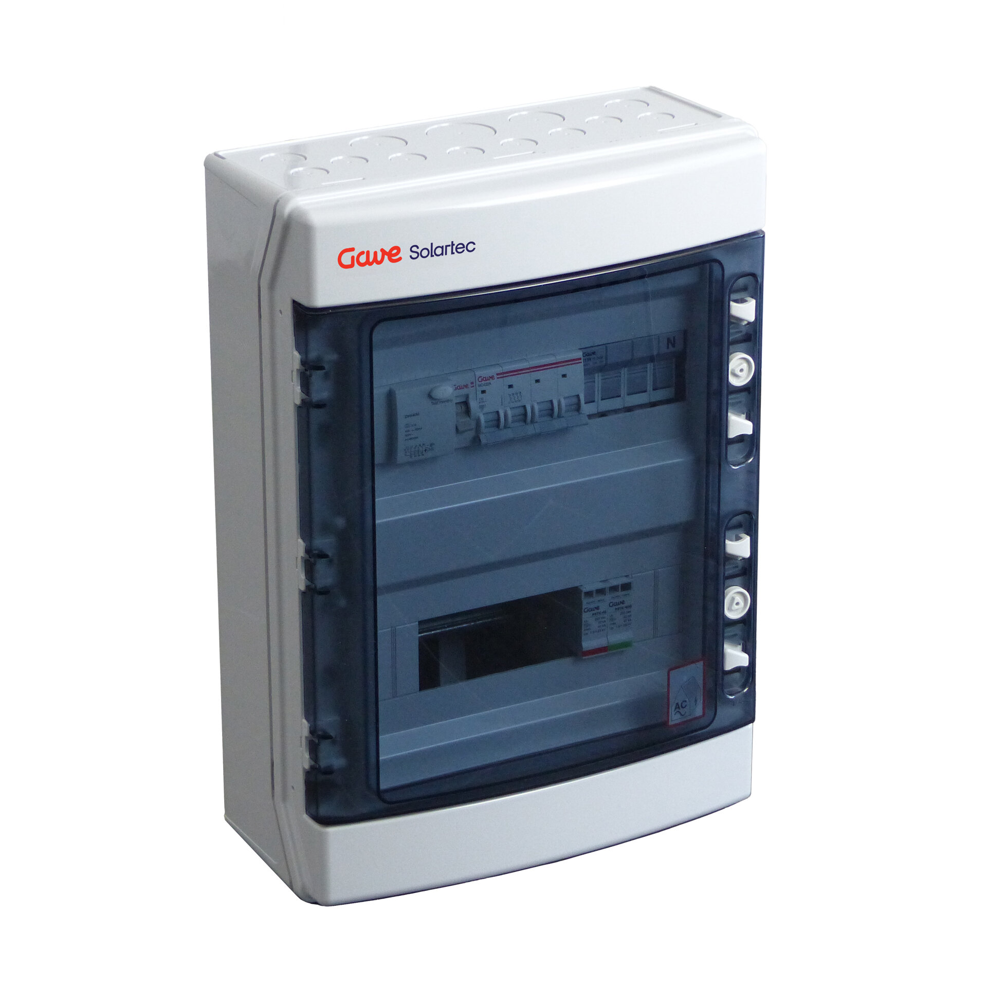 Caja modular de conexión equipada con protección automático, diferencial y sobretensiones. Interruptor automático 3 polos + neutro 10A curva C poder de corte 6kA - UNE-EN 60898-1. Interruptor diferencial tetrapolar tipo A sensibilidad 30mA para corrientes alternas con componentes de continua, protegido contra disparos intempestivos 0,25kA, UNE-EN 61008-1. Protector de sobretensiones Clase II In 20kA Imax 40kA Up 1,5kV UNE-EN 61643-11 con protección fusible asociada. Caja en policarbonato de doble aislamiento clase II apto para uso exterior con una elevada resistencia a los golpes (IK08). Espacio adicional para incorporar dispositivos modulares. Dimensiones de 436x310x148