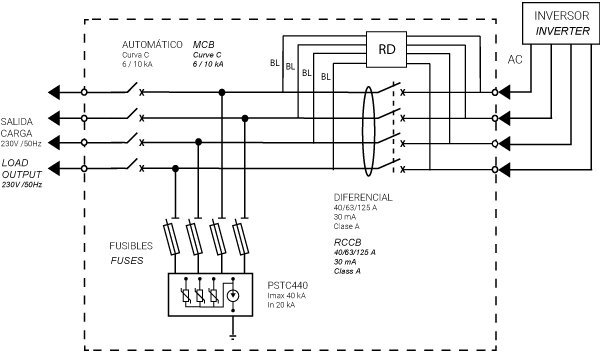 Caja modular de conexión equipada con protección automático, diferencial y sobretensiones. Interruptor automático 3 polos + neutro 40A curva C poder de corte 6kA - UNE-EN 60898-1. Interruptor diferencial tetrapolar tipo A sensibilidad 30mA para corrientes alternas con componentes de contínua, protegido contra disparos intempestivos 0,25kA, UNE-EN 61008-1 con rearme automático conforme UNE-EN 63024. Protector de sobretensiones Clase II In 20kA Imax 40kA Up 1,5kV UNE-EN 61643-11 con protección fusible asociada. Caja en policarbonato de doble aislamiento clase II apto para uso exterior con una elevada resistencia a los golpes (IK08). Dimensiones de 286x418x148mm