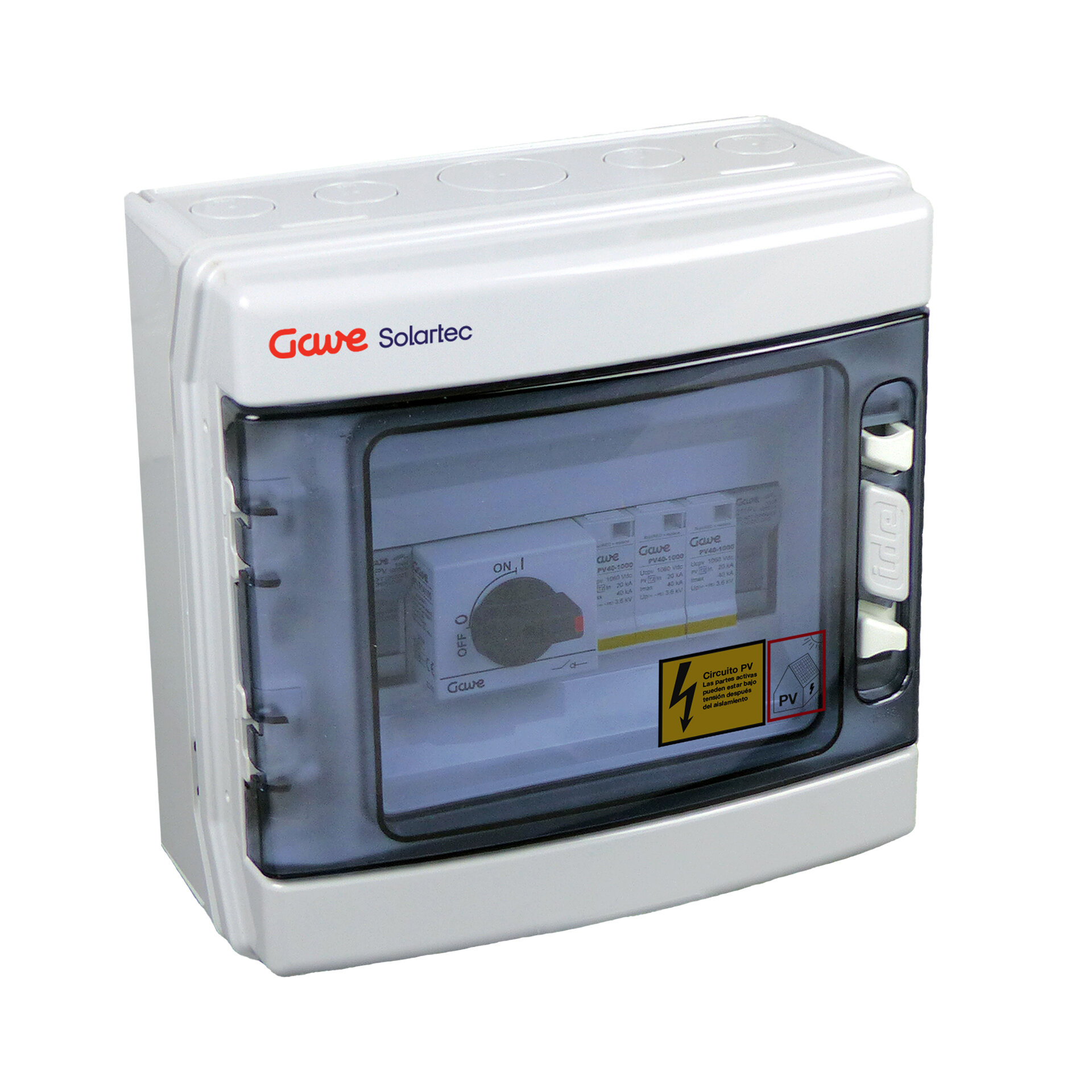 Caja conexión PV modular para 1 strings + base y fusible 15A gPV + seccionador 25 A + protector sobretensión clase I+II tensión máxima de 1000Vdc, para realizar instalaciones con toda seguridad. Caja en policarbonato de doble aislamiento clase II apto para uso exterior con una elevada resistencia a los golpes (IK08). Dimensiones de 231x238x118mm.