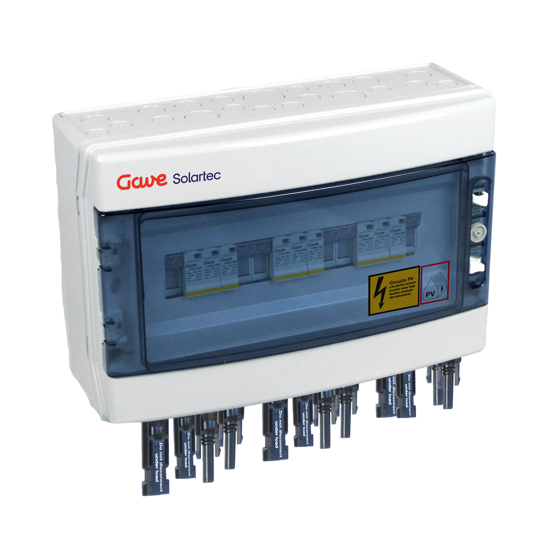 Caja de protección PV modular para 3MPPT, 1string x mppt (3 entradas, 3 salidas) MC4x base y fusible 15A gPV + protector sobretensión clase II tensión máxima de 1000Vdc, para realizar instalaciones con toda seguridad. Suministrado con MC4 para cada string, con los conectores aéreos para evitar problemas de incompatibilidades según la IEC TR 63225. Caja en policarbonato de doble aislamiento clase II apto para uso exterior con una elevada resistencia a los golpes (IK08). Dimensiones de 286x418x148mm.