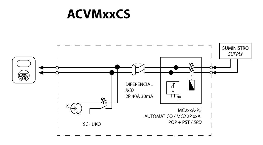 CAJA MODULAR PROTECCION RECARGA VE 1P+N 25A CON PROTECTOR SOBRETENSION PERMANENTE Y TRANSITORIA Y TOMA SCHUKO 1P+N 16A
