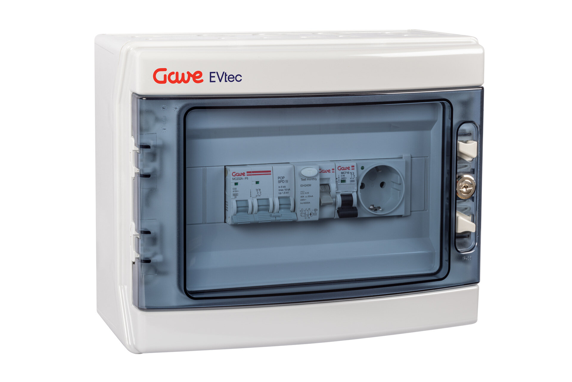 Caja protección modular para punto de recarga de vehículo de 1P+N 25A con protección sobretensión permanente y transitoria clase II, para realizar instalaciones con toda seguridad. Interruptor automático 1P+N 25A curva C poder de corte 6kA - UNE-EN 60898-1. Interruptor diferencial bipolar tipo A sensibilidad 30mA para corrientes alternas con componentes de continua, protegido contra disparos intempestivos 0,25kA, UNE-EN 61008-1. Protector de sobretensiones Clase II In 15kA. Incluye toma de corriente de carril con protección magnetotérmica 1P+N 16A. Caja en policarbonato de doble aislamiento clase II apto para uso exterior con una elevada resistencia a los golpes (IK08) con llave de seguridad. Dimensiones de 246x310x148mm.
