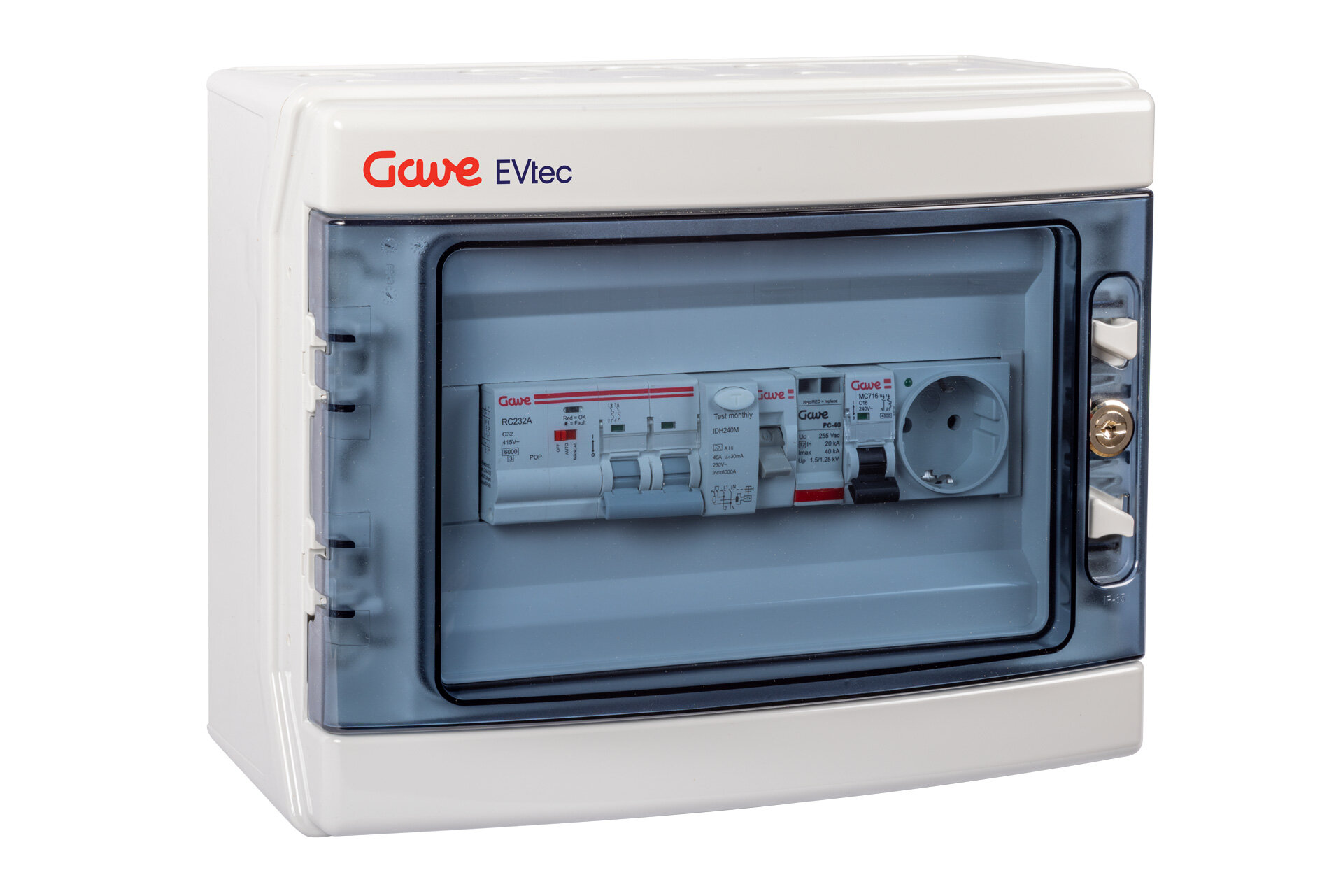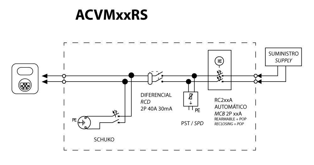 Caja protección modular para punto de recarga de vehículo de 1P+N 40A con rearme automático, protección sobretensión permanente y transitoria clase II, para realizar instalaciones con toda seguridad. Interruptor automático 1P+N 40A curva C poder de corte 6kA - UNE-EN 60898-1. Interruptor diferencial bipolar tipo A sensibilidad 30mA para corrientes alternas con componentes de continua, protegido contra disparos intempestivos 0,25kA, UNE-EN 61008-1. Protector de sobretensiones Clase II In 20kA. Incluye toma de corriente de carril con protección magnetotérmica 1P+N 16A. Caja en policarbonato de doble aislamiento clase II apto para uso exterior con una elevada resistencia a los golpes (IK08) con llave de seguridad. Dimensiones de 246x310x148mm.