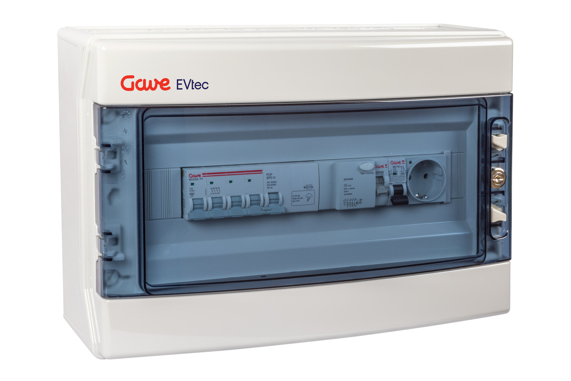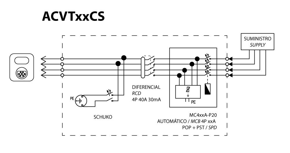 Caja protección modular para punto de recarga de vehículo de 3P+N 16A con protección sobretensión permanente y transitoria clase II, para realizar instalaciones con toda seguridad. Interruptor automático 3P+N 16A curva C poder de corte 6kA - UNE-EN 60898-1. Interruptor diferencial tetrapolar tipo A sensibilidad 30mA para corrientes alternas con componentes de continua, protegido contra disparos intempestivos 0,25kA, UNE-EN 61008-1. Protector de sobretensiones Clase II In 15kA. Incluye toma de corriente de carril con protección magnetotérmica 1P+N 16A. Caja en policarbonato de doble aislamiento clase II apto para uso exterior con una elevada resistencia a los golpes (IK08) con llave de seguridad. Dimensiones de 286x418x148mm.