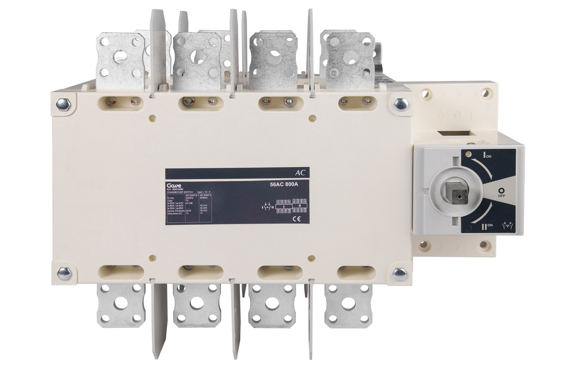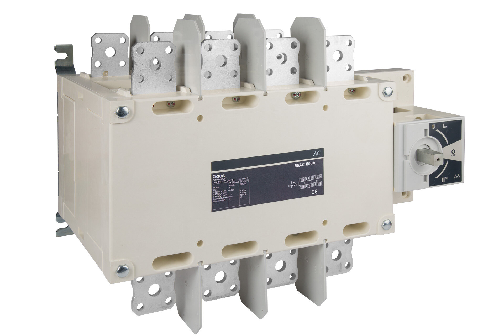 Conmutador manual de la serie 56AC de 4 polos 800A. Tamaño B5 de medidas 321x466x298. Opera en cargas AC-23A 415V/690V y cargas DC-21 440V. Corte plenamente aparente. Las altas prestaciones de los materiales utilizados le confieren una alta resistencia térmica y dinámica. Suministrado sin mando se puede utilizar con múltiples tipos de mandos y múltiples accesorios como ejes prolongados, puentes de unión, pantallas de separación o protección y contactos auxiiares.