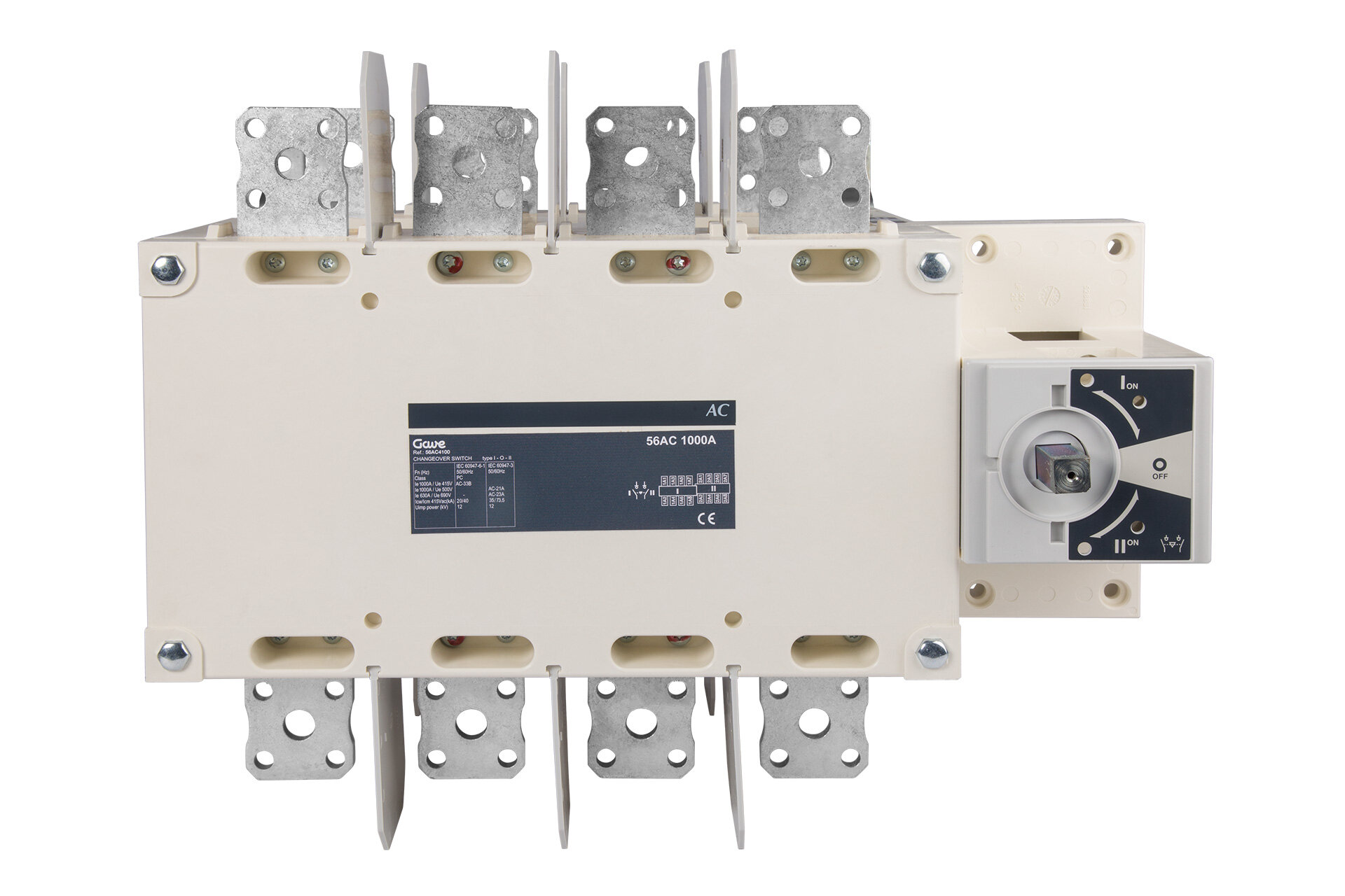 Conmutador manual de la serie 56AC de 4 polos 1000A. Tamaño B5 de medidas 321x466x298. Opera en cargas AC-23A 415V/690V y cargas DC-21 440V. Corte plenamente aparente. Las altas prestaciones de los materiales utilizados le confieren una alta resistencia térmica y dinámica. Suministrado sin mando se puede utilizar con múltiples tipos de mandos y múltiples accesorios como ejes prolongados, puentes de unión, pantallas de separación o protección y contactos auxiiares.