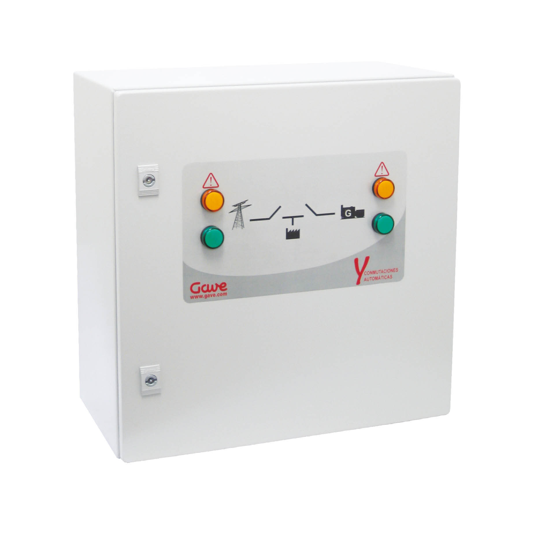Cuadro de transferencia automática 4P 40A con panel sinóptico de señalización. Lógica de control de la transferencia mediante relés de supervisión de tensión y temporizadores modulares de fácil ajuste y programación. Envolvente tamaño 500x500x250 en chapa metálica y tratamiento de pintura protectora contra la corrosión color RAL7035 y grado de protección IP66. Panel frontal del cuadro con sinóptico con pilotos indicativos de fuente de suministro conectada y/o anomalías. Operación local manual de emergencia. Conexionado de potencia por bornes de jaula 1,5-16mm2. Terminales de control para arranque/paro de generador 0,5-2,5mm2.