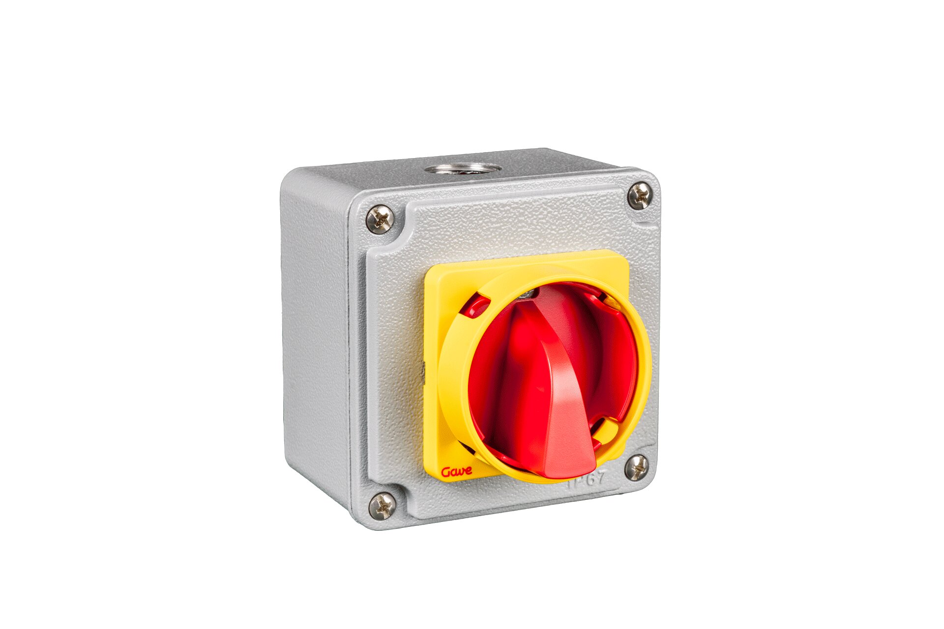 Interruptor-seccionador 3 polos 40A resistente al fuego clase F600 según EN 12101-3. Caja 1AC en aluminio color gris RAL7035 con superfície tratada para resistir a la corrosión, medidas 150x150x95. Grado de protección IP65. 2 entradas superiores y 2 salidas inferiores M25. Fijación a superfície por 4 puntos. Mando rojo/amarillo bloqueable por candados (hasta 4 de 8mm de diámetro). Conexionado con bornes de jaula para cable 6-16 mm².
