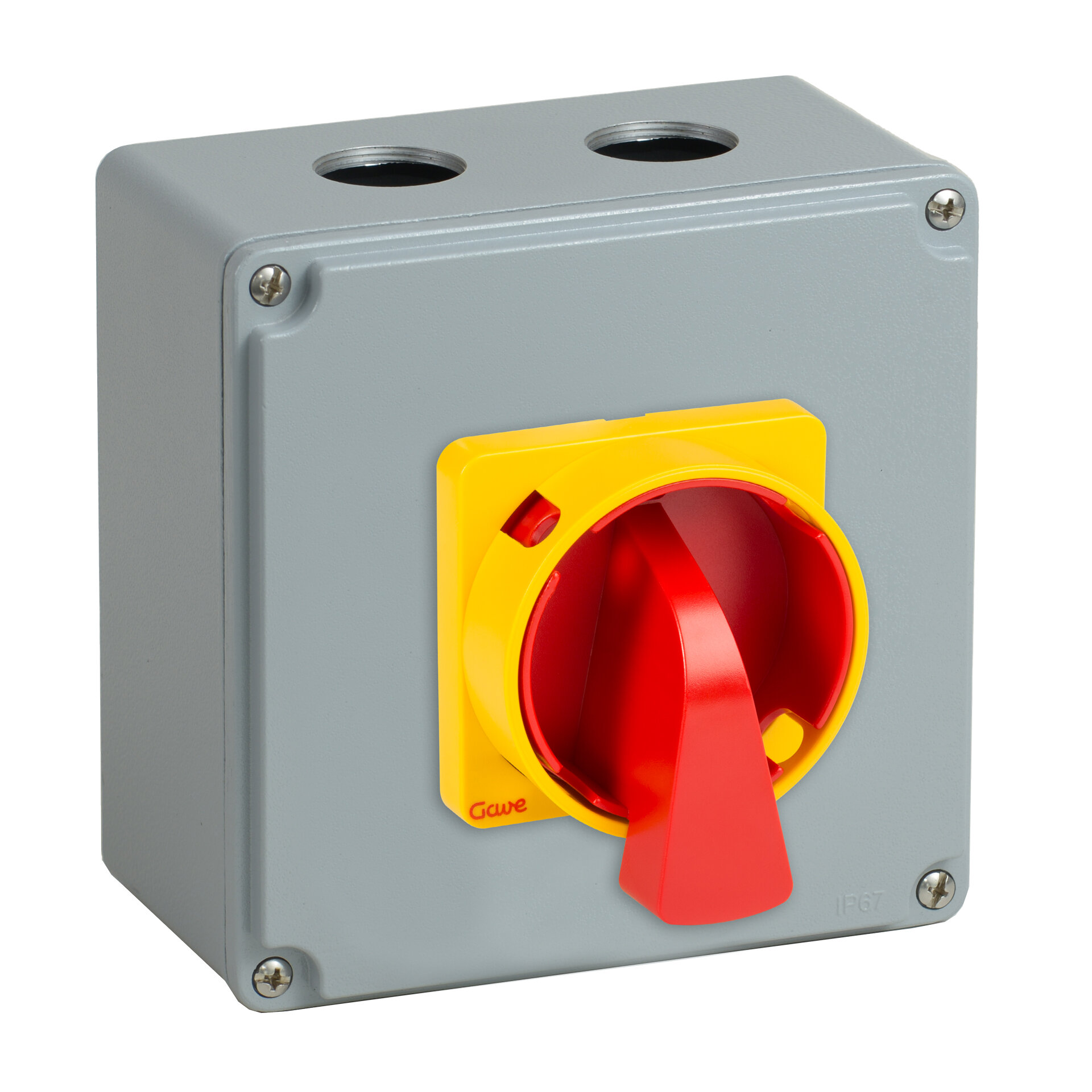 Interruptor-seccionador 6 polos 40A resistente al fuego clase F400 según EN 12101-3. Caja 3AL en aluminio color gris RAL7040 con superficie de acabado rugoso tratada para resistir a la corrosión, medidas 160x160x90. Grado de protección IP65. 2 entradas superior y salidas inferior M32 agujeros roscados. Fijación a superficie por 4 puntos. Mando rojo/amarillo bloqueable por candados (hasta 4 de 8mm de diámetro). Conexionado con bornes de jaula para cable 6-16 mm².