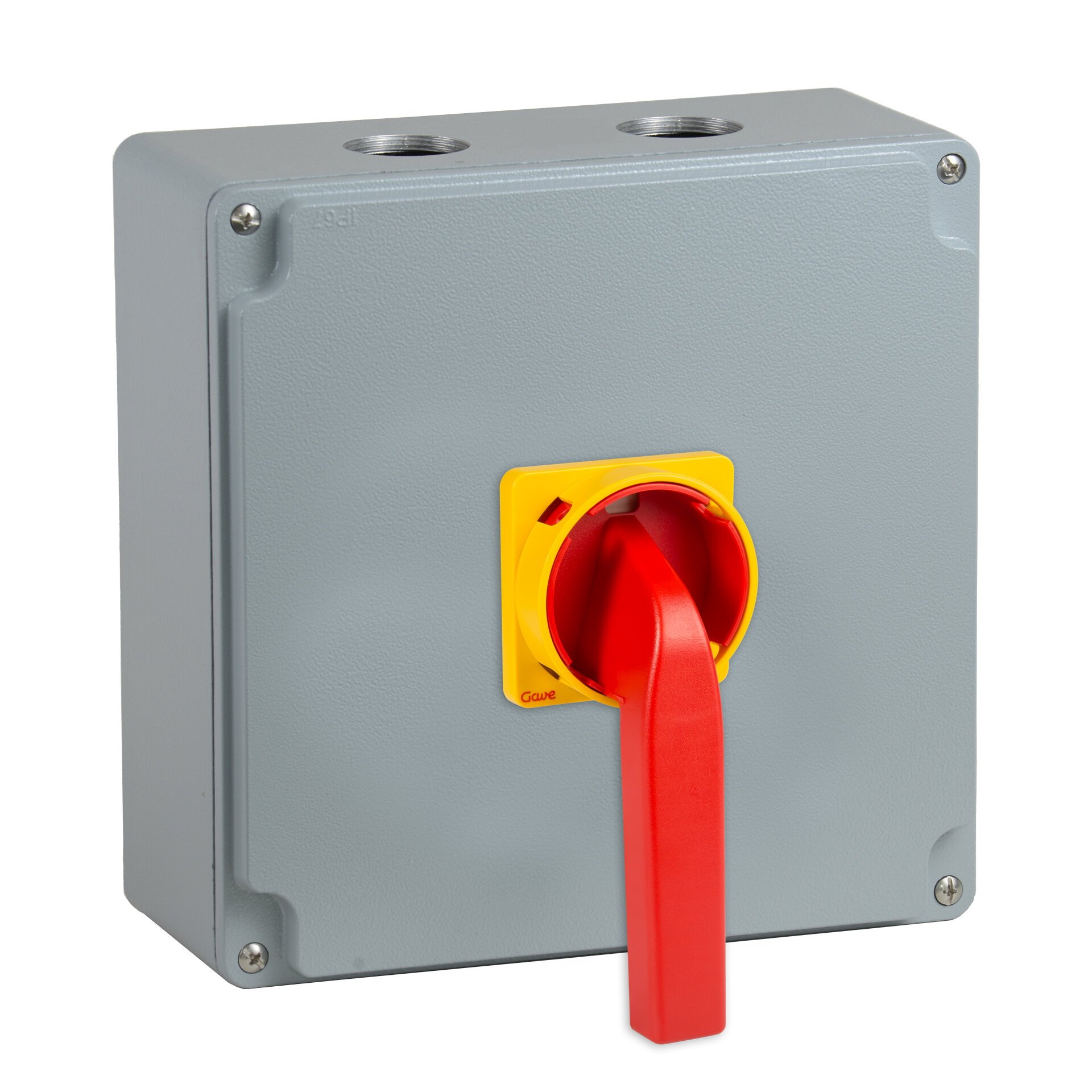 Interruptor-seccionador 6 polos 125A resistente al fuego clase F400 según EN 12101-3. Caja 4AL en aluminio color gris RAL7040 con superfície de acabado rugoso tratada para resistir a la corrosión, medidas 250x250x111. Grado de protección IP65. 2 entradas superior y 2 salidas inferior M40 con agujeros roscados. Fijación a superfície por 4 puntos. Mando pistola rojo/amarillo bloqueable por candados (hasta 4 de 8mm de diámetro). Conexionado con bornes de jaula para cable 16-35 mm².