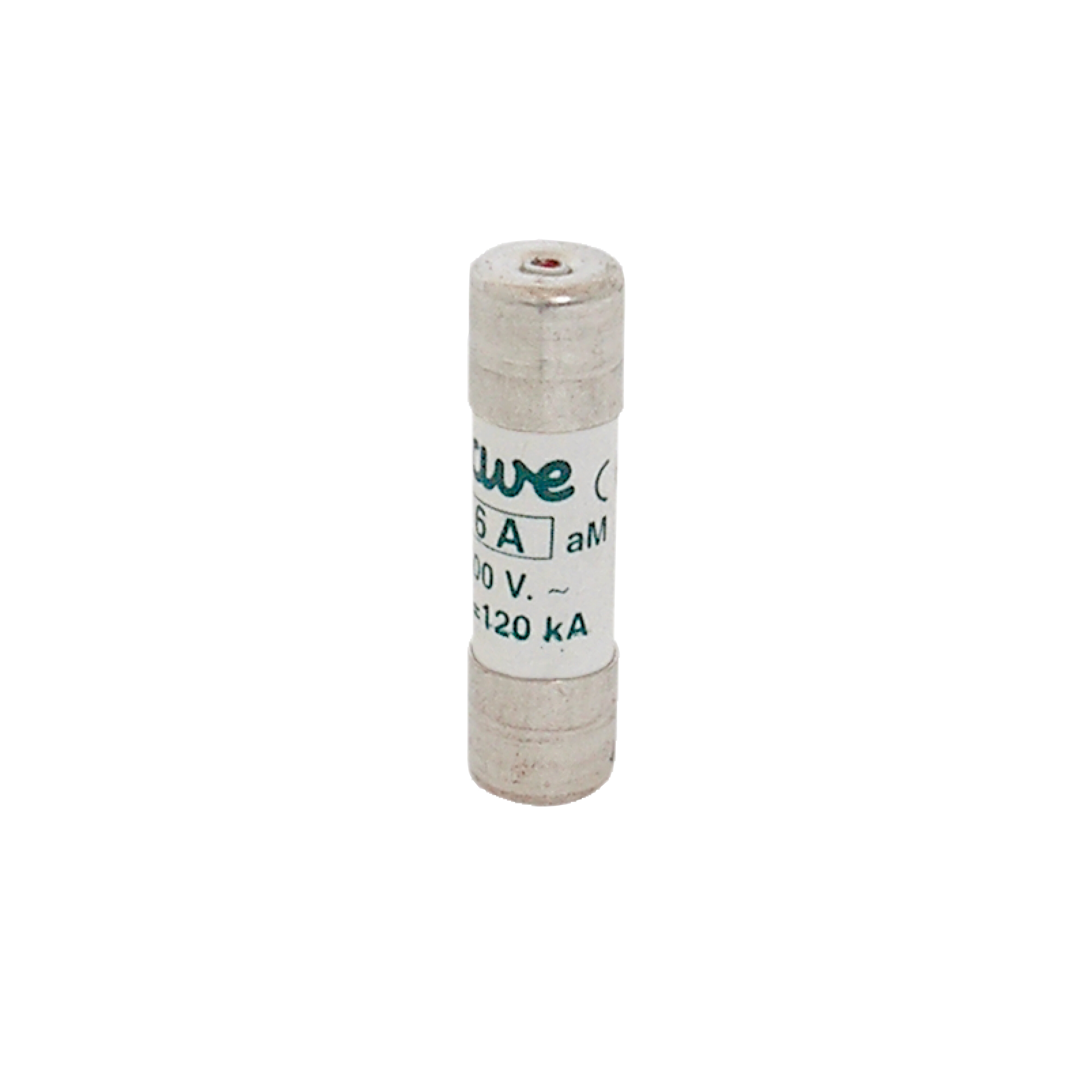 Cartucho fusible cilindrico tamaño 0 de dimensiones 10x38 y corriente nominal de 6A con curva de protección clase aM. Incorpora indicador de fusión que actua mediante muelle tratado contra la corrosión y el envejecimiento. Adecuado para la protección de motores, transformadores y equipos con elevadas puntas de arranque. Para tensiones hasta 500V ofrece protección contra la sobrecarga y cortocircuito con una capacidad de ruptúra de 120kA. Cerámica altamente resistente a los choques térmicos y a la presión. Contactos de cápsula en cobre con baño de plata.