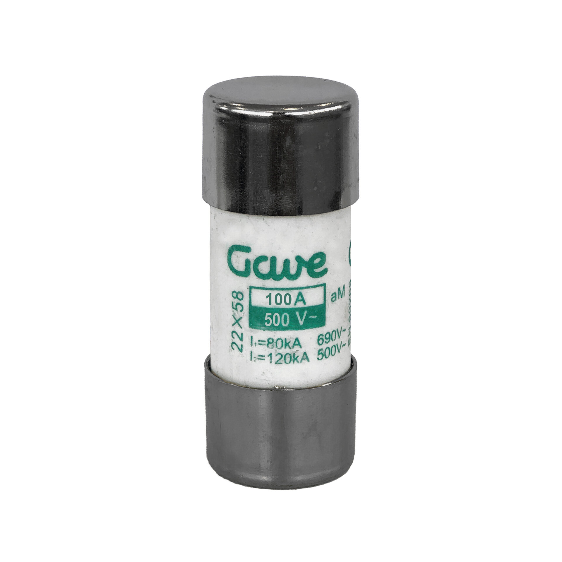 Cartucho fusible cilindrico tamaño 2 de dimensiones 22x58 y corriente nominal de 100A con curva de protección clase aM. Adecuado para la protección de motores, transformadores y equipos con elevadas puntas de arranque. Para tensiones hasta 500V ofrece protección contra la sobrecarga y cortocircuito con una capacidad de ruptúra de 120kA. Cerámica altamente resistente a los choques térmicos y a la presión. Contactos de cápsula en cobre con baño de plata.