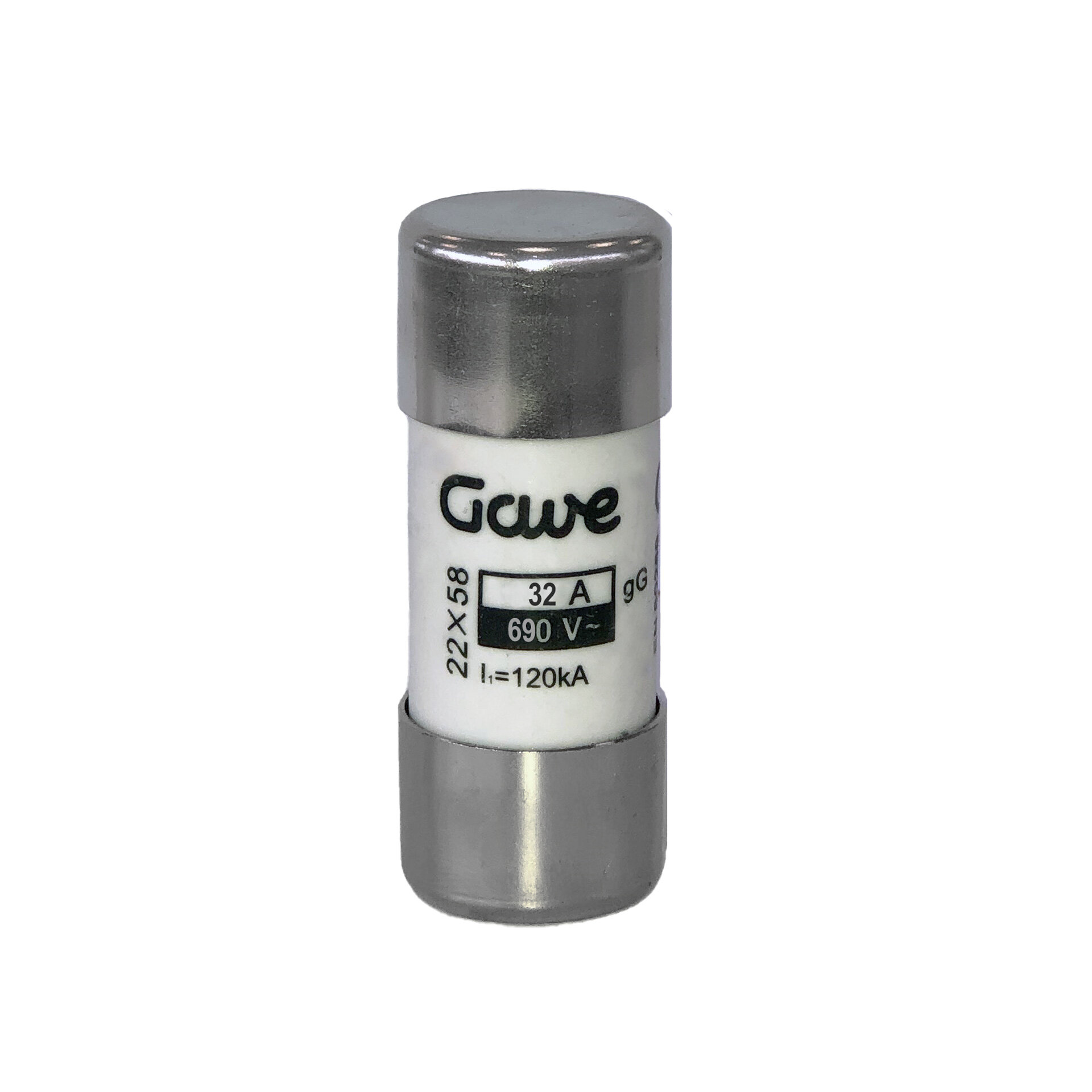 Cartucho fusible cilindrico tamaño 2 de dimensiones 22x58 y corriente nominal de 32A con curva de protección clase gG. Adecuado para la protección de líneas o equipos para tensiones hasta 690V ofrece protección contra la sobrecarga y cortocircuito con una capacidad de ruptúra de 120kA hasta 500V y 80kA para 690V. Cerámica altamente resistente a los choques térmicos y a la presión. Contactos de cápsula en cobre con baño de plata.