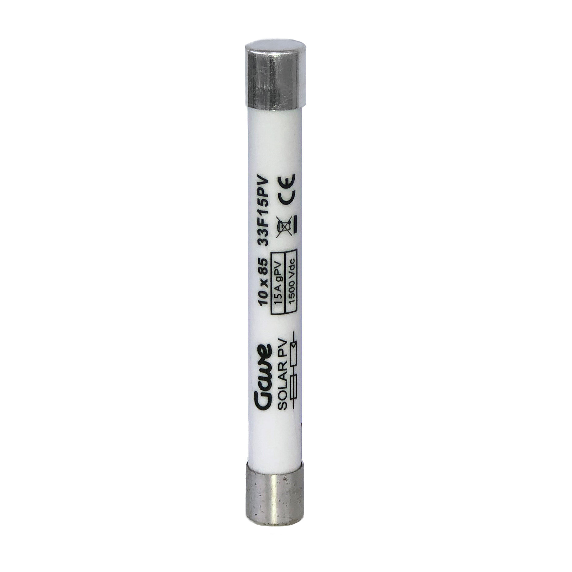 Fusible cilindrico tamaño 10x85 15A curva gPV 1500V. Calibrado para cortar las lijeras sobrecargas características de los circuitos fotovoltáicos. Cerámica altamente resistente a los choques térmicos. Contactos de doble cápsula con baño de plata.