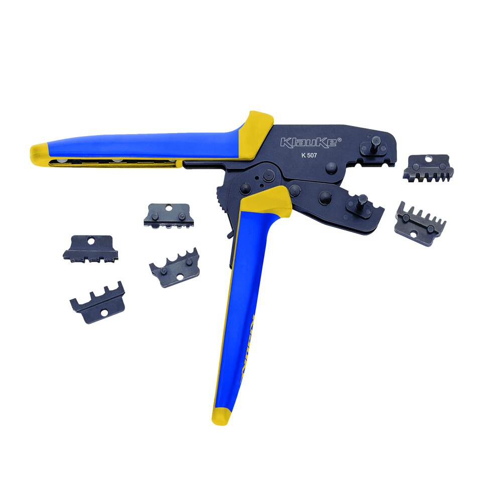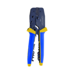 Prensaterminales manual con matrices intercambiables de alta capacidad de prensado, cambio fácil y ágil de las matrices mediante pasador, empuñadura de diseño ergonómico en materiales suaves y antideslizantes, hueco dentro de la empuñadura para en almacenamiento de las matrices, suministro con matrices AE501 para prensado de punteras con rango de secciones de 0,14mm2 a 10mm2, AE5071 para prensado de conectores aislados con rango de secciones de0,5mm2 a 6 mm2 y Q501 para prensado de terminales desnudos sin soldadura con rango de secciones de 0,5mm2 a 10mm2, herramienta de 220mm de longitud y 0,635 Kg de peso.