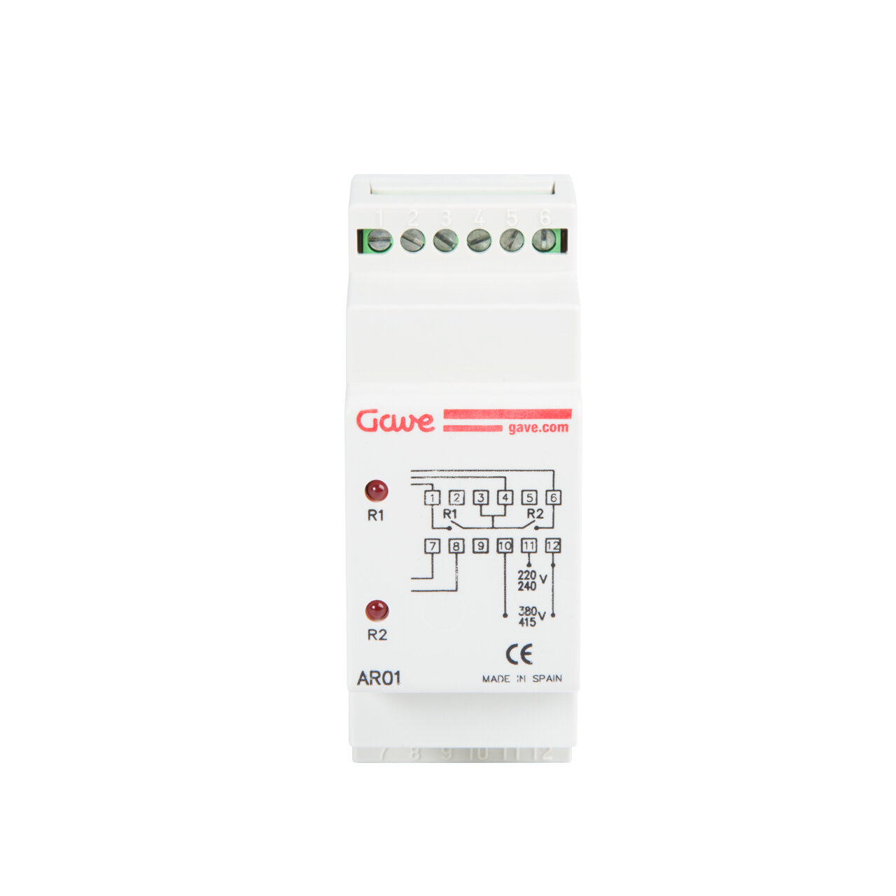 Relé de alternancia AR01 para 2 bombas. Conmuta alternativamente dos salidas (grupos de bombas, compresores, etc) a cada impulso de señal externa. Bitensión 230/400 V AC. Montaje sobre carril DIN. Ancho 2 módulos (35 mm). Consumo 2 VA. Poder de corte contactos salida 8 A/250 V AC cosφ=1. LEDs indicadores del estado de los relés. Tiempo mínimo de conmutación 0,5 s.