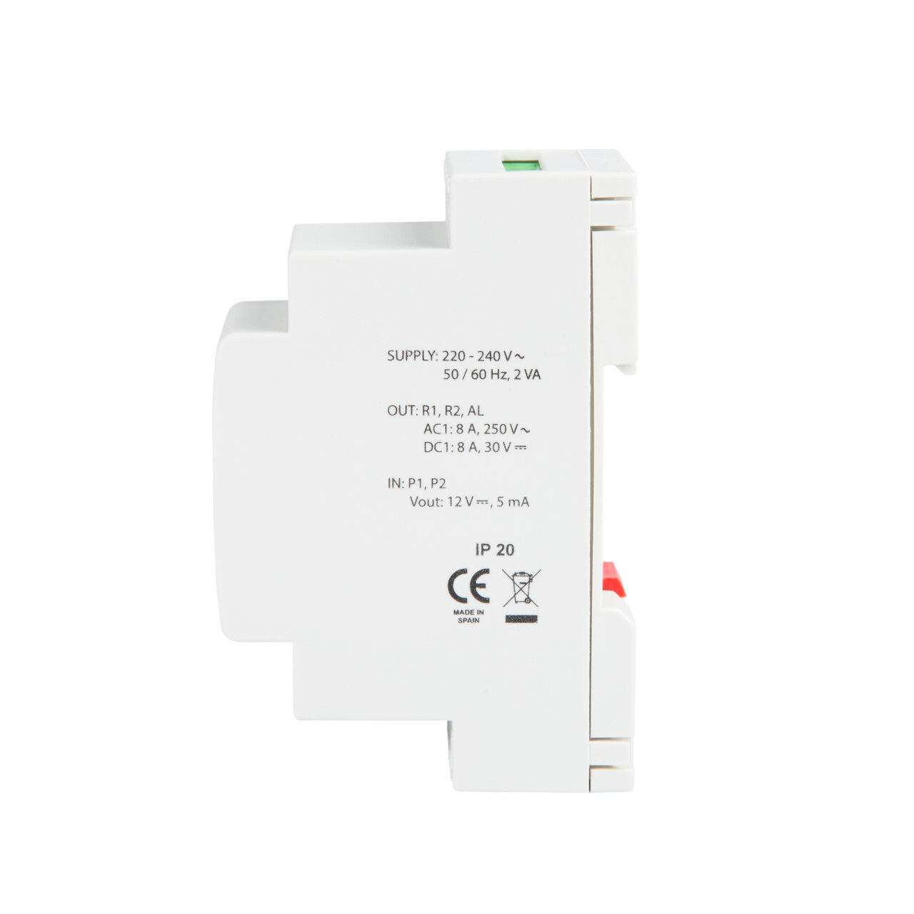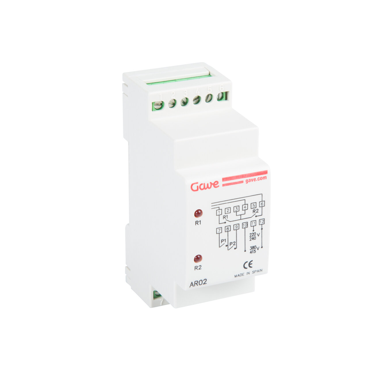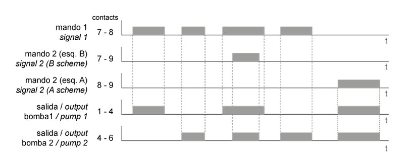 Relé de alternancia AR02 para 2 bombas con simultaneidad. Conmuta alternativamente dos salidas (grupos de bombas, compresores, etc) a cada impulso de señal externa (P1), con posibilidad de mantener las dos salidas activas al mismo tiempo mediante una segunda señal de entrada (P1+P2). Bitensión 230/400 V AC. Montaje sobre carril DIN. Ancho 2 módulos (35 mm). Consumo 2 VA. Poder de corte contactos salida 8 A/250 V AC cosφ=1. LEDs indicadores del estado de los relés. Tiempo mínimo de conmutación 0,5 s.