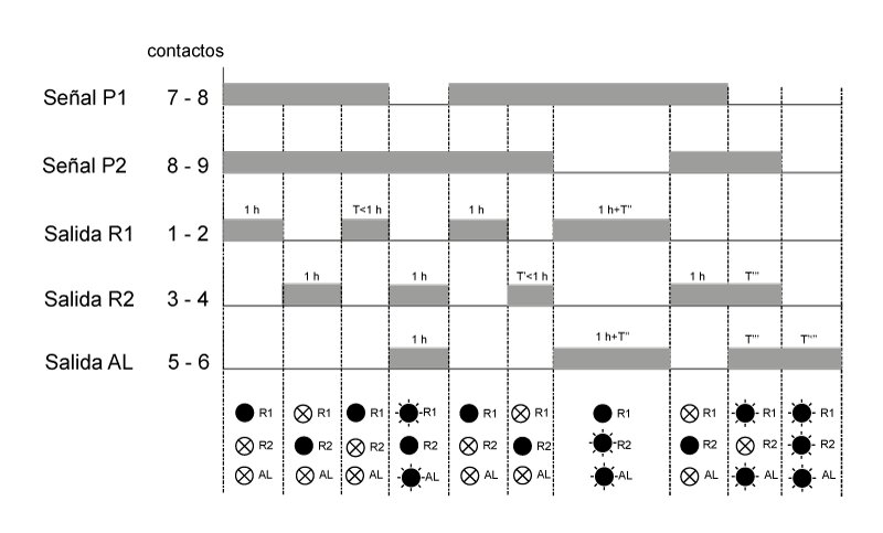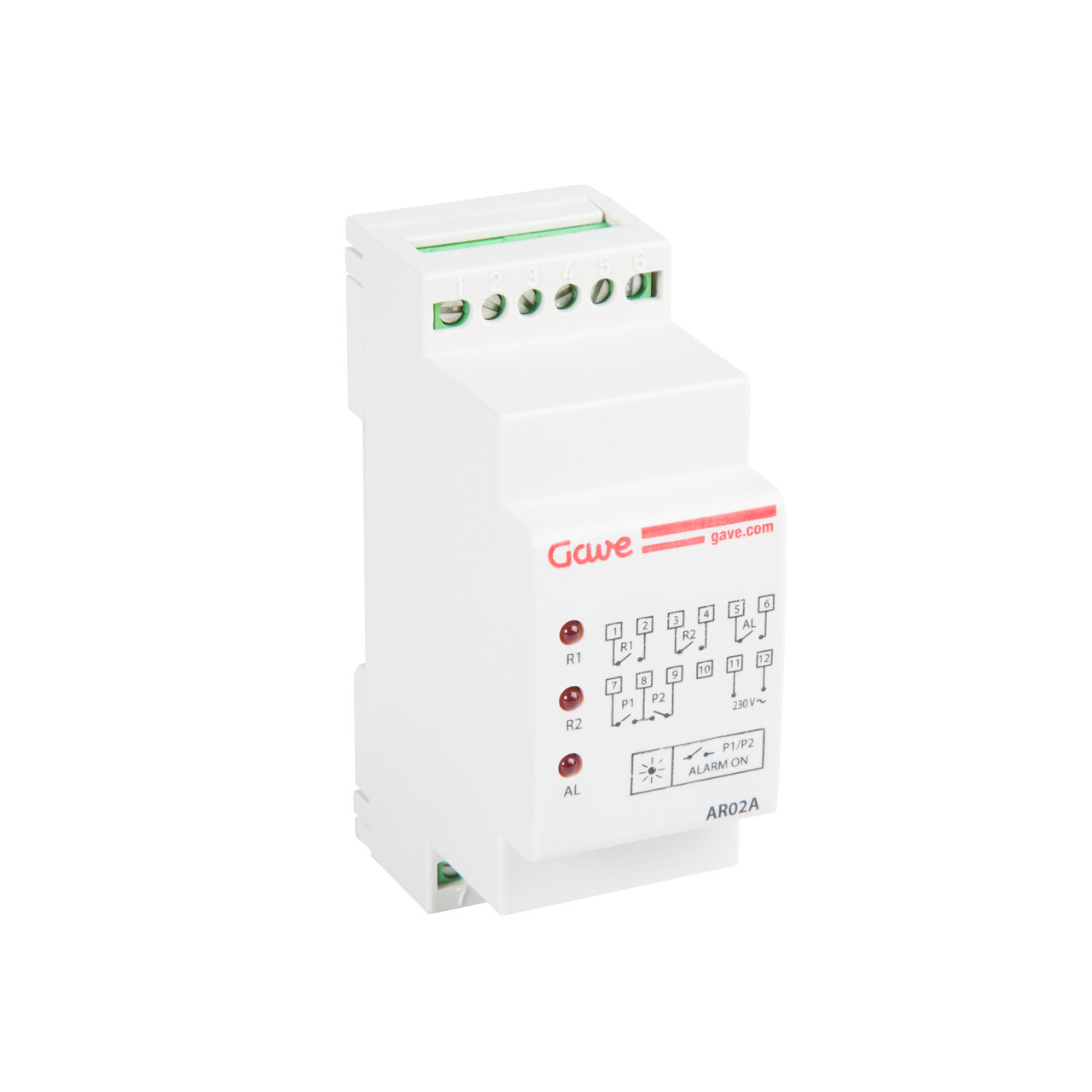 Relé de alternancia AR02A para 2 bombas con simultaneidad. Conmuta alternativamente dos salidas (grupos de bombas, compresores, etc) a cada impulso de señal externa (P1), con posibilidad de mantener las dos salidas activas al mismo tiempo mediante una segunda señal de entrada (P1+P2), tensión de alimentación 230V AC, en caso de avería de una bomba arranque automático de la otra y activación del relé de alarma, paro del sistema en el caso de avería de ambas bombas,montaje sobre carril DIN. Ancho 2 módulos (35 mm). Consumo 2 VA. Poder de corte contactos salida 8 A/250 V AC cosφ=1. LEDs indicadores del estado de los relés. Tiempo mínimo de conmutación 0,5 s.