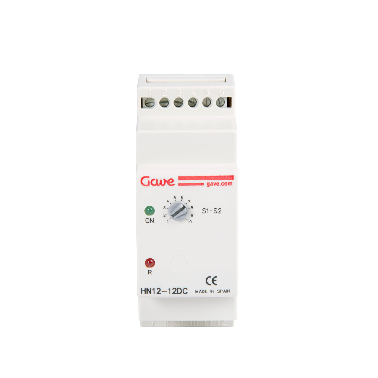 Interruptor de nivel simple para pozo o depósito. Alimentación 12 V DC. Montaje sobre perfil DIN o sobre panel. Ancho 2 módulos (35 mm). Consumo 2 VA. Poder de corte contactos salida 8 A/250 V AC cosφ=1. Sensibilidad ajustable.