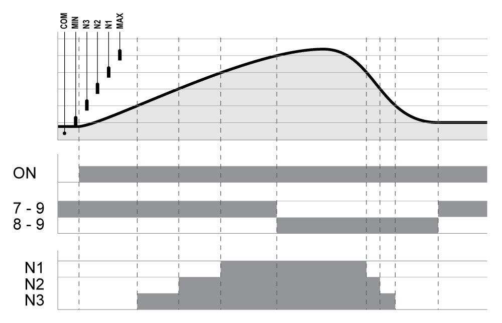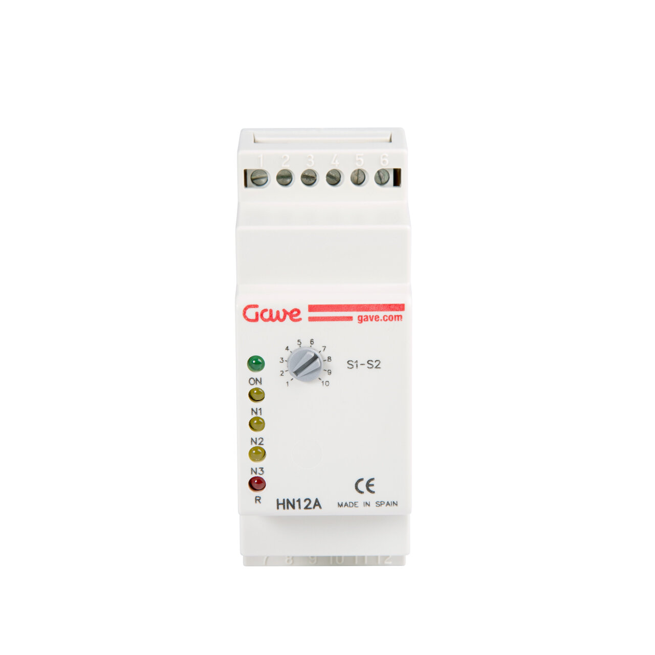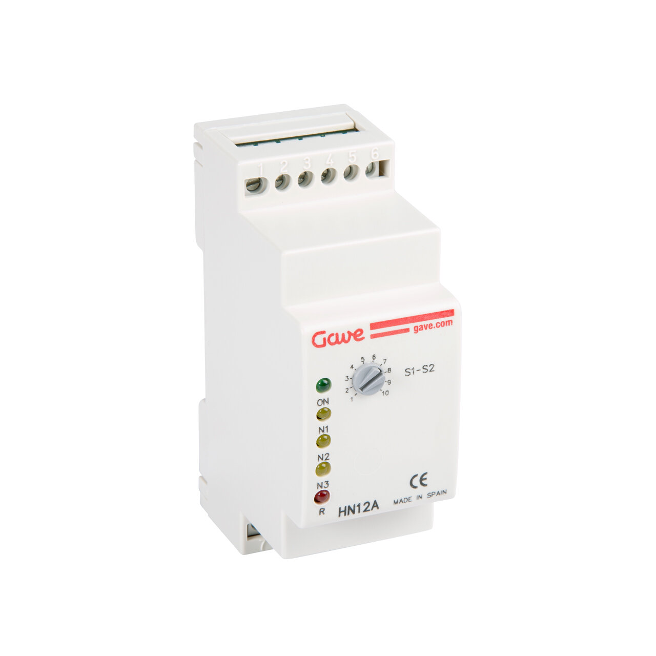 Interruptor de nivel simple para pozo o depósito con indicación de tres niveles intermedios. Bitensión 230/400 V AC. Montaje sobre perfil DIN o sobre panel. Ancho 2 módulos (35 mm). Consumo 2 VA. Poder de corte contactos salida 8 A/250 V AC cosφ=1. Sensibilidad ajustable.