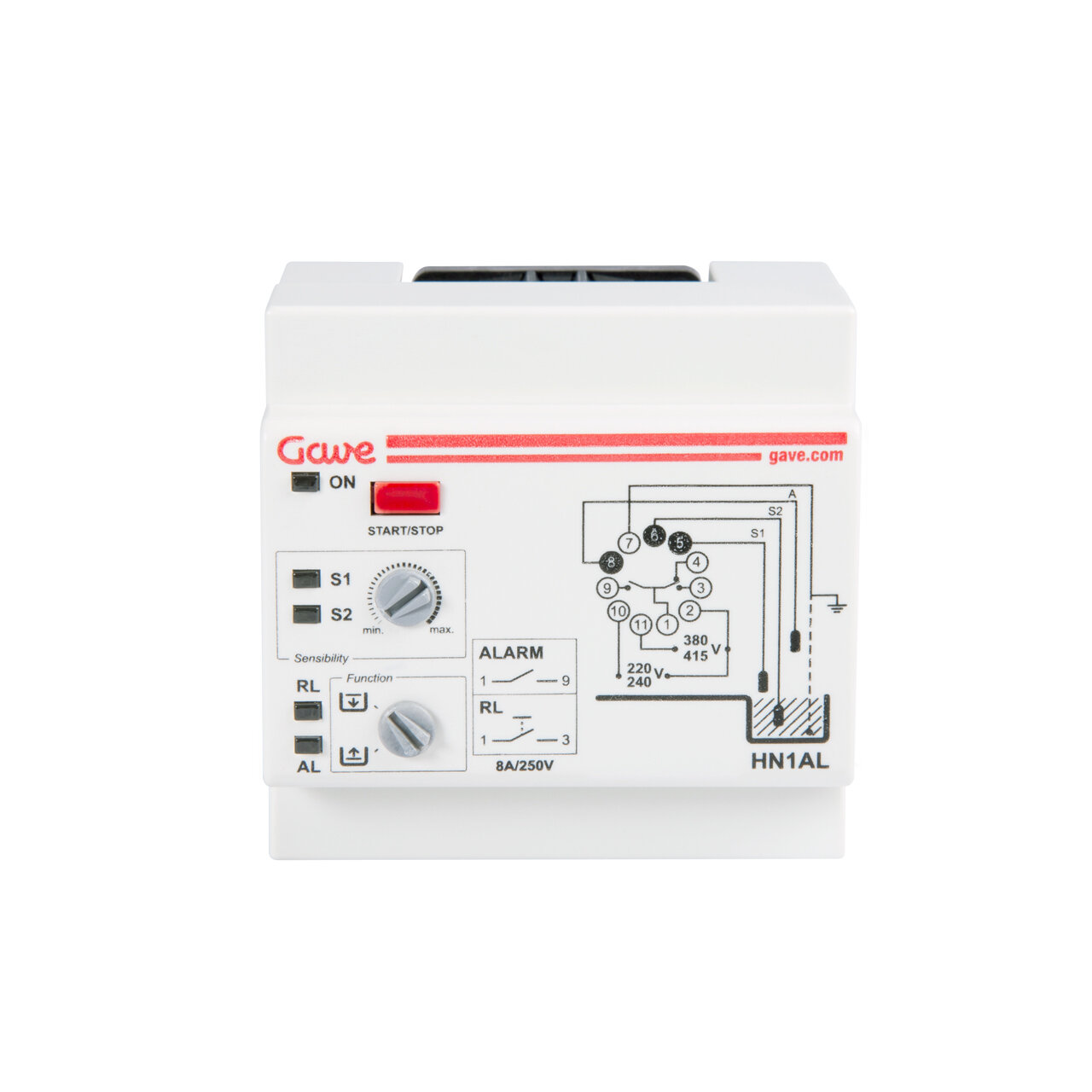 Interruptor de nivel simple para pozo o depósito con alarma enchufable sobre base undecal. Entregado con sondas y base. Bitensión 230/400 V AC. Montaje sobre perfil DIN o sobre panel. Ancho 4 módulos (70 mm). Consumo 2,5 VA. Poder de corte contactos salida 8 A/250 V AC cosφ=1. Selector de función vaciado/llenado. Sensibilidad ajustable. Indicación LED de las sondas de nivel. Función Start/Stop. Función OVR/Test.