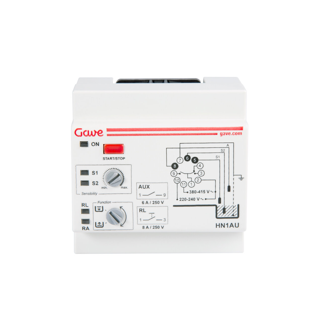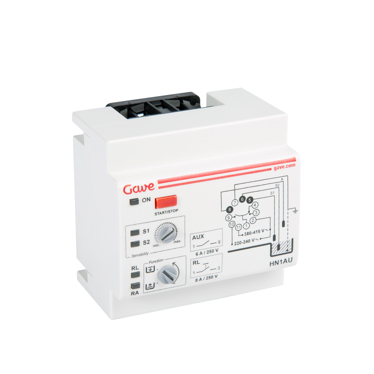Interruptor de nivel simple para pozo o depósito enchufable sobre base undecal. Entregado con sondas y base. Bitensión 230/400 V AC. Montaje sobre perfil DIN o sobre panel. Ancho 4 módulos (70 mm). Consumo 2,5 VA. Poder de corte contactos salida 8 A/250 V AC cosφ=1. Selector de función vaciado/llenado. Sensibilidad ajustable. Indicación LED de las sondas de nivel. Función Start/Stop. Función OVR/Test.
