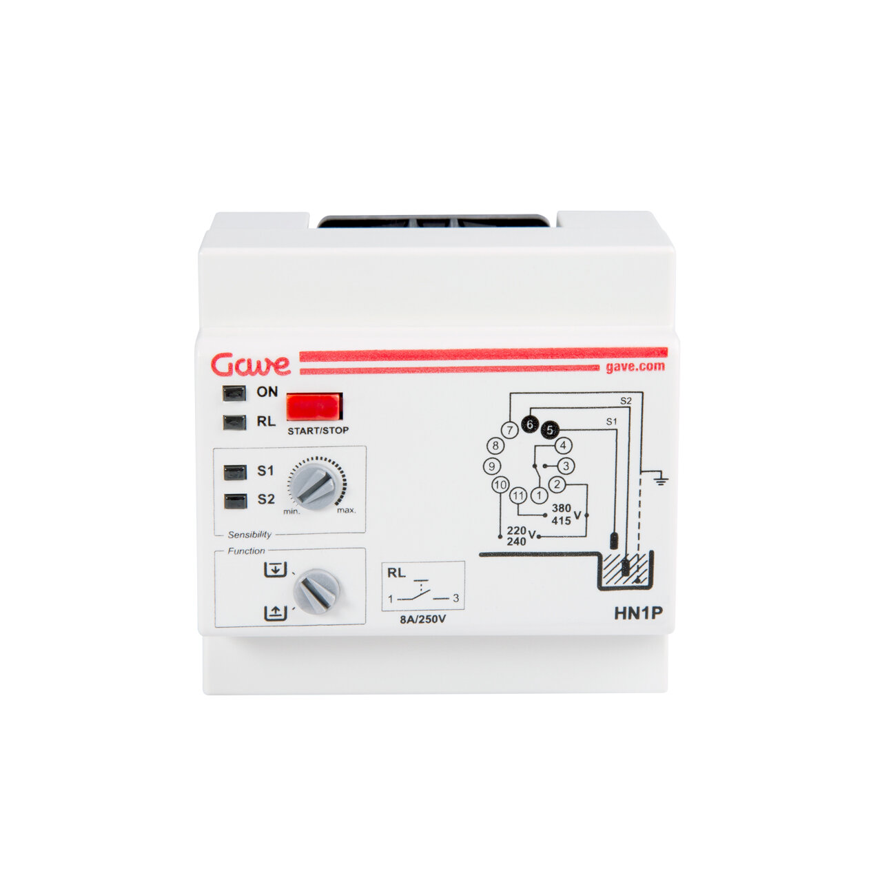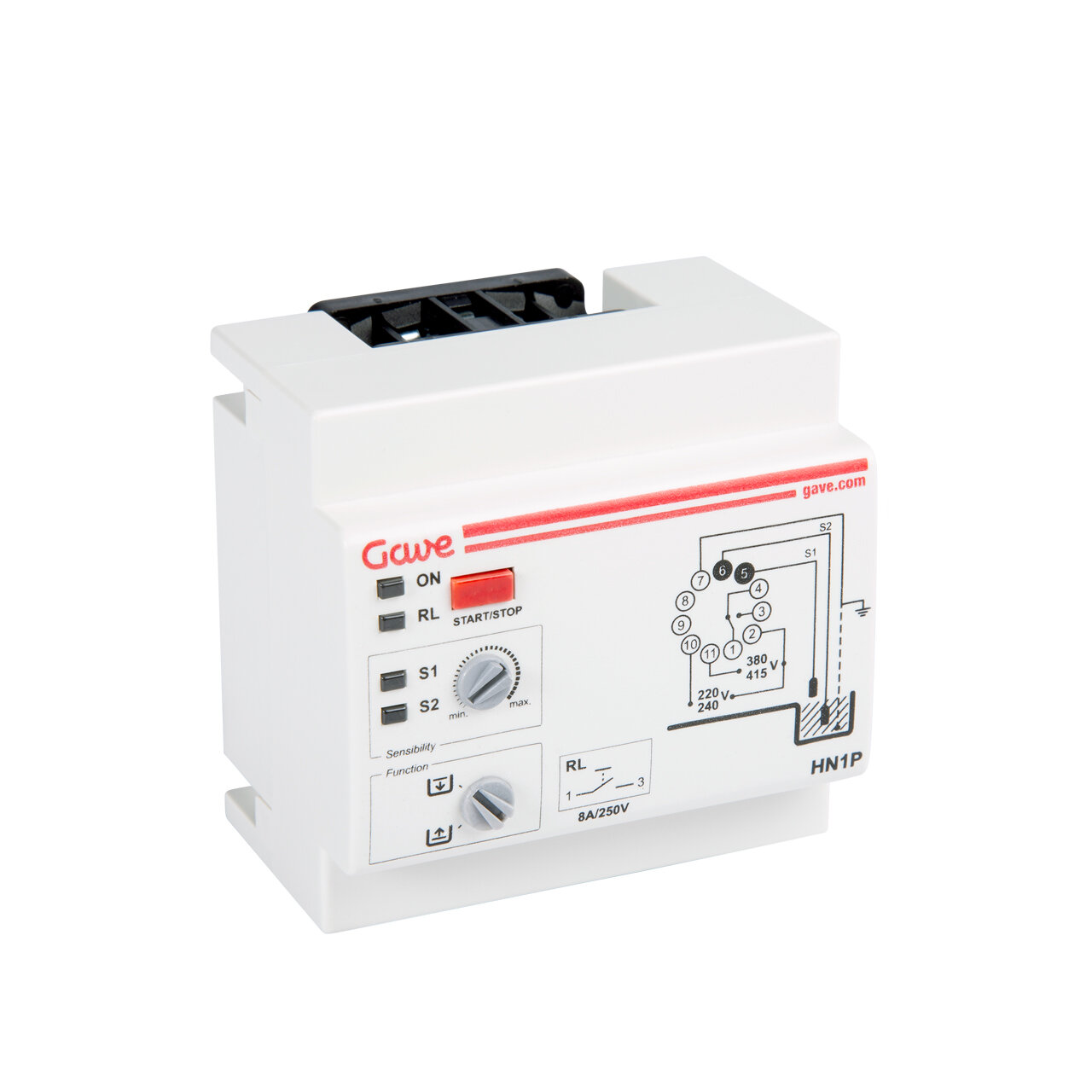 Interruptor de nivel simple para pozo o depósito enchufable sobre base undecal. Versión protegida a 2500 V cresta, tanto la entrada de la alimentación como la entrada de las sondas (equivalente a las perturbaciones producidas por la caída de un rayo en la red). Entregado con sondas y base. Bitensión 230/400 V AC. Montaje sobre perfil DIN o sobre panel. Ancho 4 módulos (70 mm). Consumo 2,5 VA. Poder de corte contactos salida 8 A/250 V AC cosφ=1. Selector de función vaciado/llenado. Sensibilidad ajustable. Indicación LED de las sondas de nivel. Función Start/Stop. Función OVR/Test.