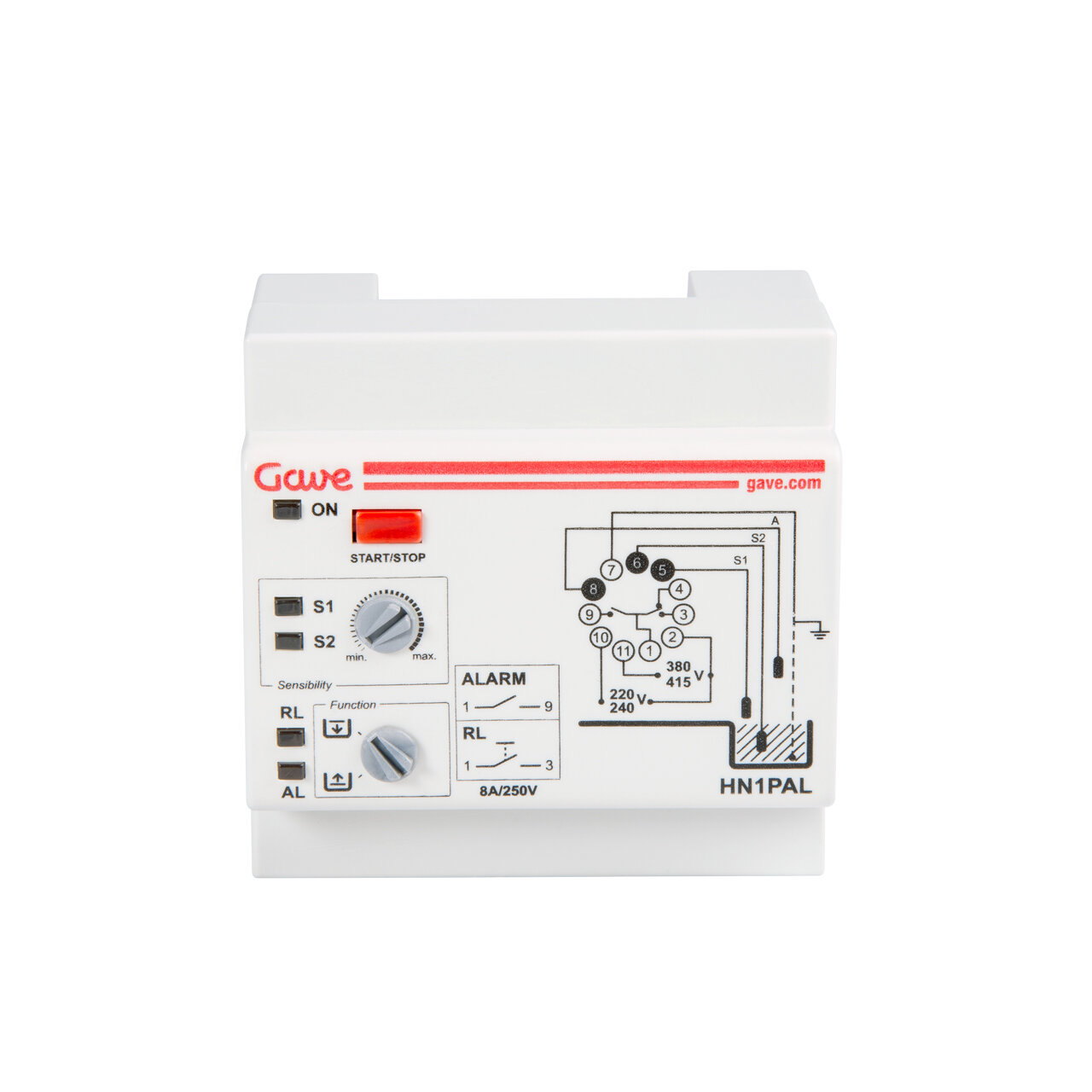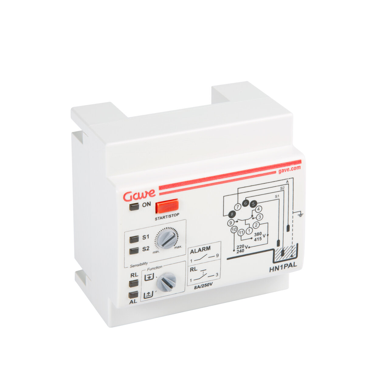 Interruptor de nivel simple para pozo o depósito con alarma enchufable sobre base undecal. Versión protegida a 2500 V cresta, tanto la entrada de la alimentación como la entrada de las sondas (equivalente a las perturbaciones producidas por la caída de un rayo en la red). Bitensión 230/400 V AC. Montaje sobre perfil DIN o sobre panel. Ancho 4 módulos (70 mm). Consumo 2,5 VA. Poder de corte contactos salida 8 A/250 V AC cosφ=1. Selector de función vaciado/llenado. Sensibilidad ajustable. Indicación LED de las sondas de nivel. Función Start/Stop. Función OVR/Test.