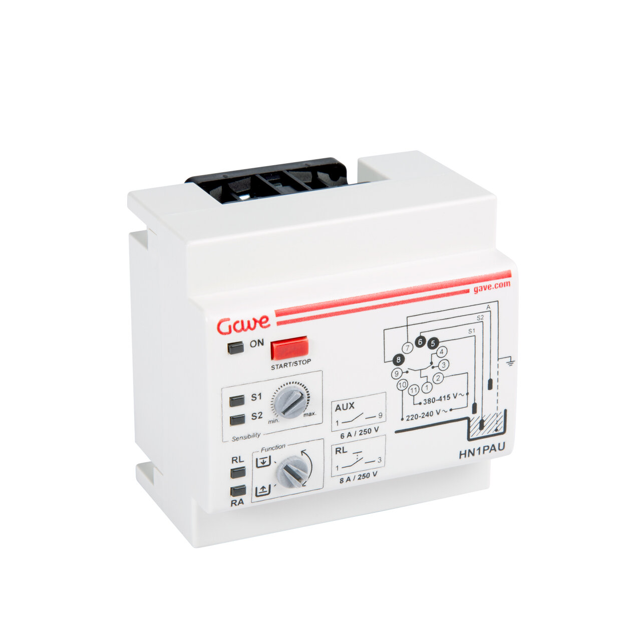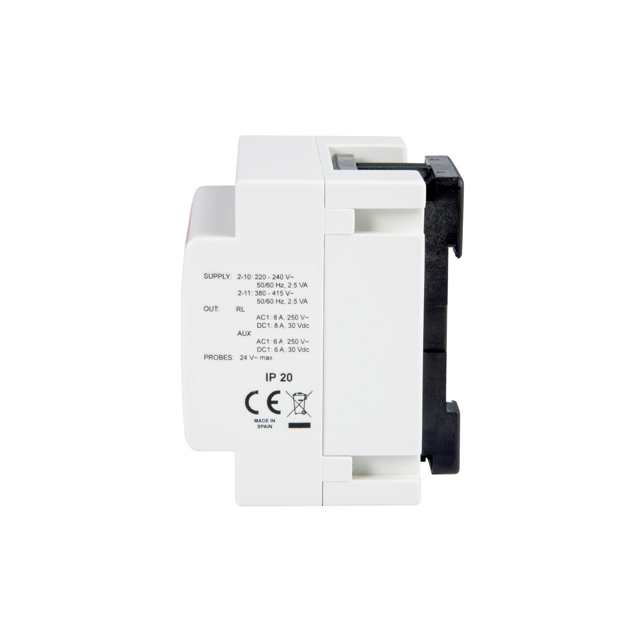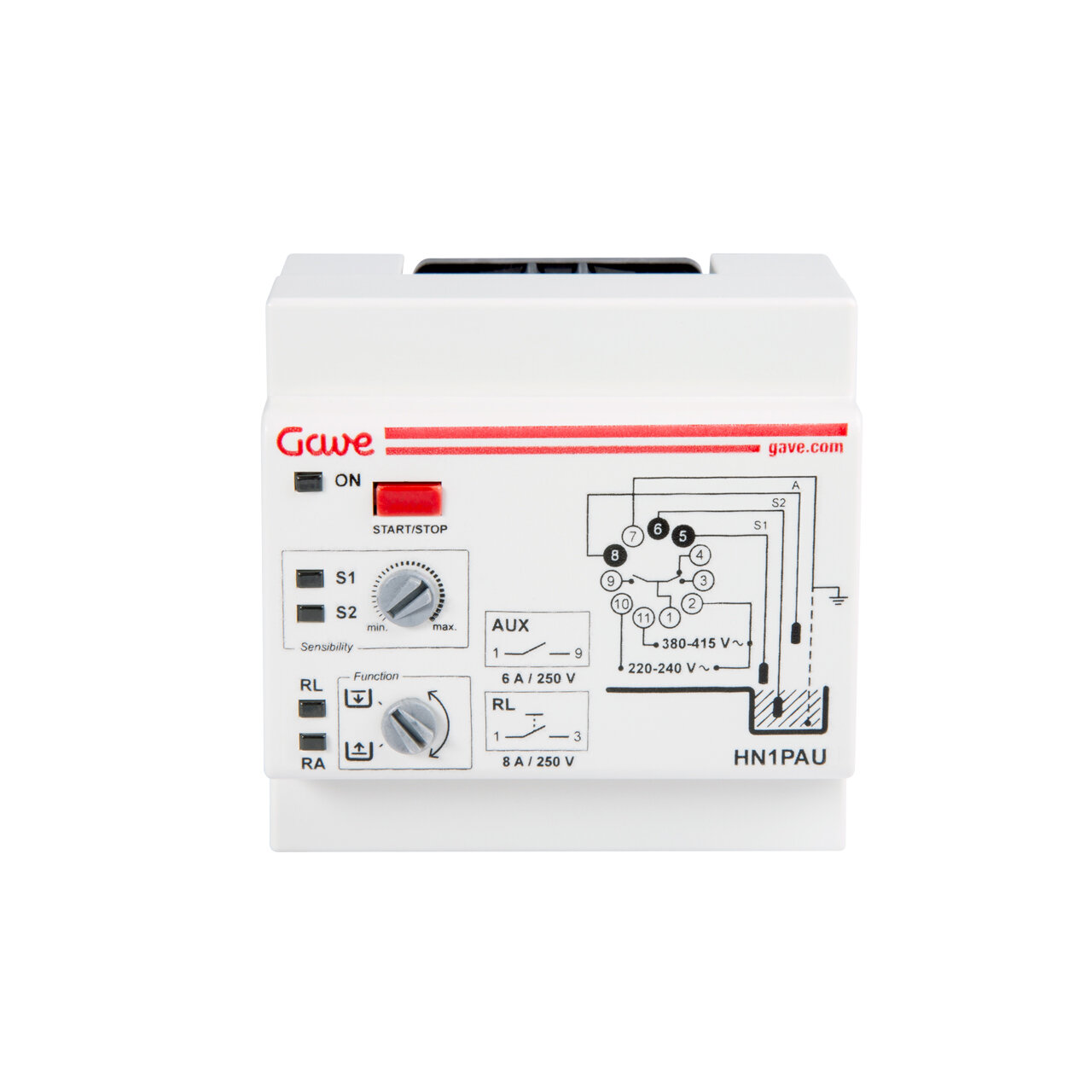 Interruptor de nivel simple para pozo o depósito enchufable sobre base undecal. Versión protegida a 2500 V cresta, tanto la entrada de la alimentación como la entrada de las sondas (equivalente a las perturbaciones producidas por la caída de un rayo en la red). Entregado con sondas y base. Bitensión 230/400 V AC. Montaje sobre perfil DIN o sobre panel. Ancho 4 módulos (70 mm). Consumo 2,5 VA. Poder de corte contactos salida 8 A/250 V AC cosφ=1. Selector de función vaciado/llenado. Sensibilidad ajustable. Indicación LED de las sondas de nivel. Función Start/Stop. Función OVR/Test.