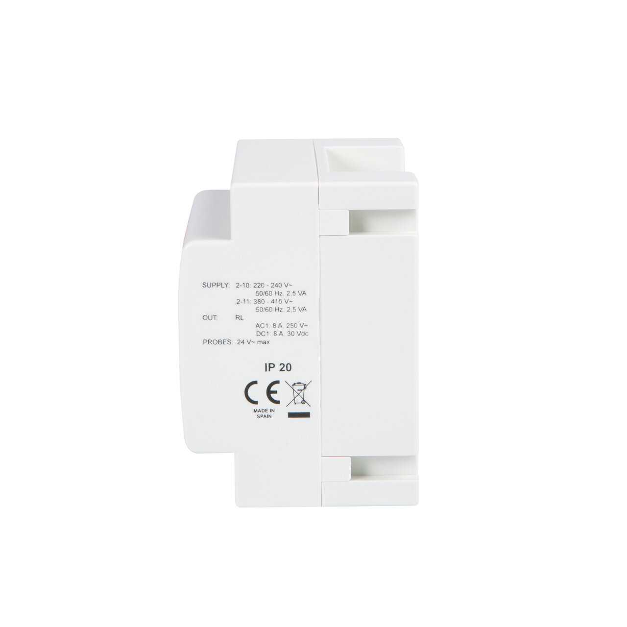 Interruptor de nivel simple para pozo o depósito enchufable sobre base undecal. Versión protegida a 2500 V cresta, tanto la entrada de la alimentación como la entrada de las sondas (equivalente a las perturbaciones producidas por la caída de un rayo en la red). Bitensión 230/400 V AC. Montaje sobre perfil DIN o sobre panel. Ancho 4 módulos (70 mm). Consumo 2,5 VA. Poder de corte contactos salida 8 A/250 V AC cosφ=1. Selector de función vaciado/llenado. Sensibilidad ajustable. Indicación LED de las sondas de nivel. Función Start/Stop. Función OVR/Test.