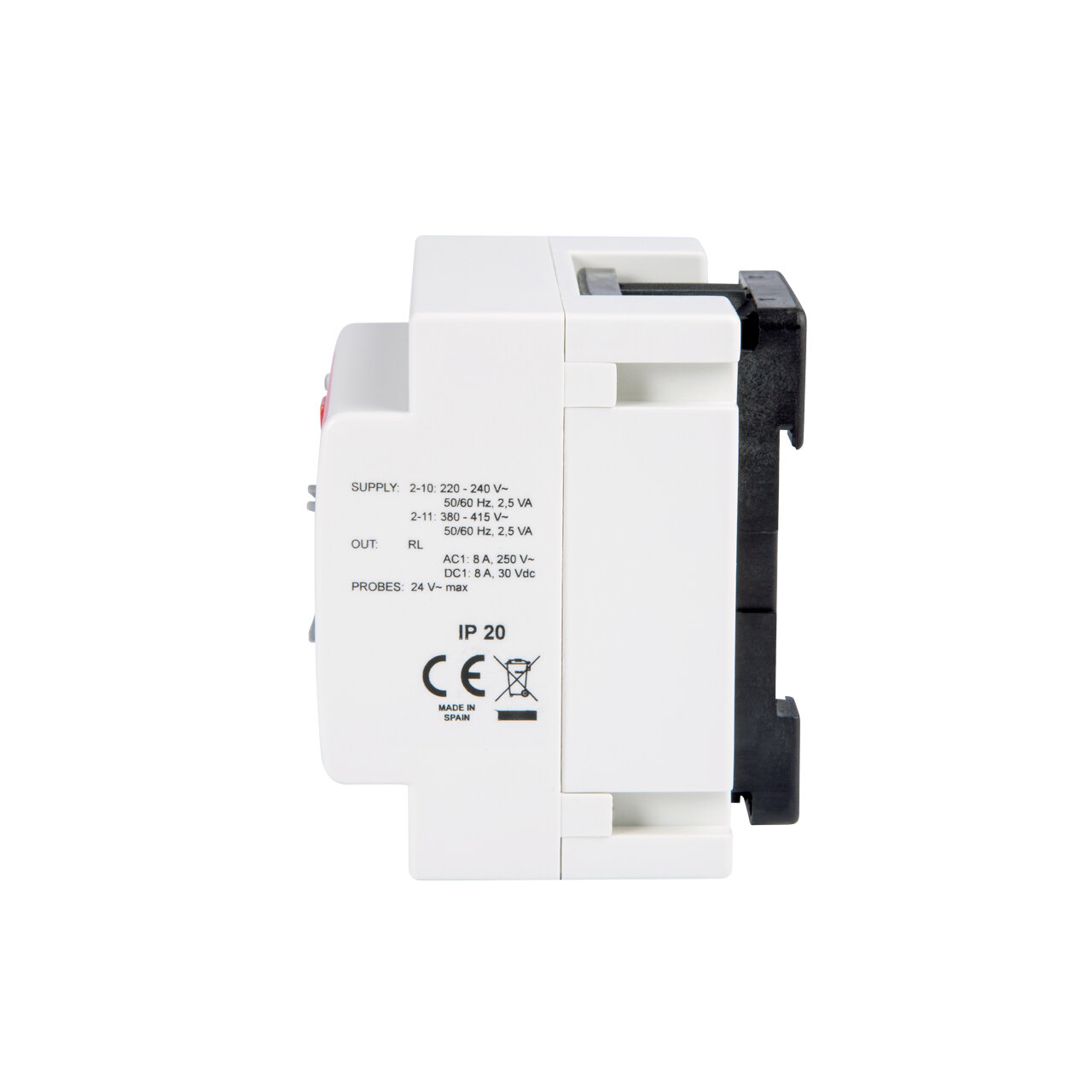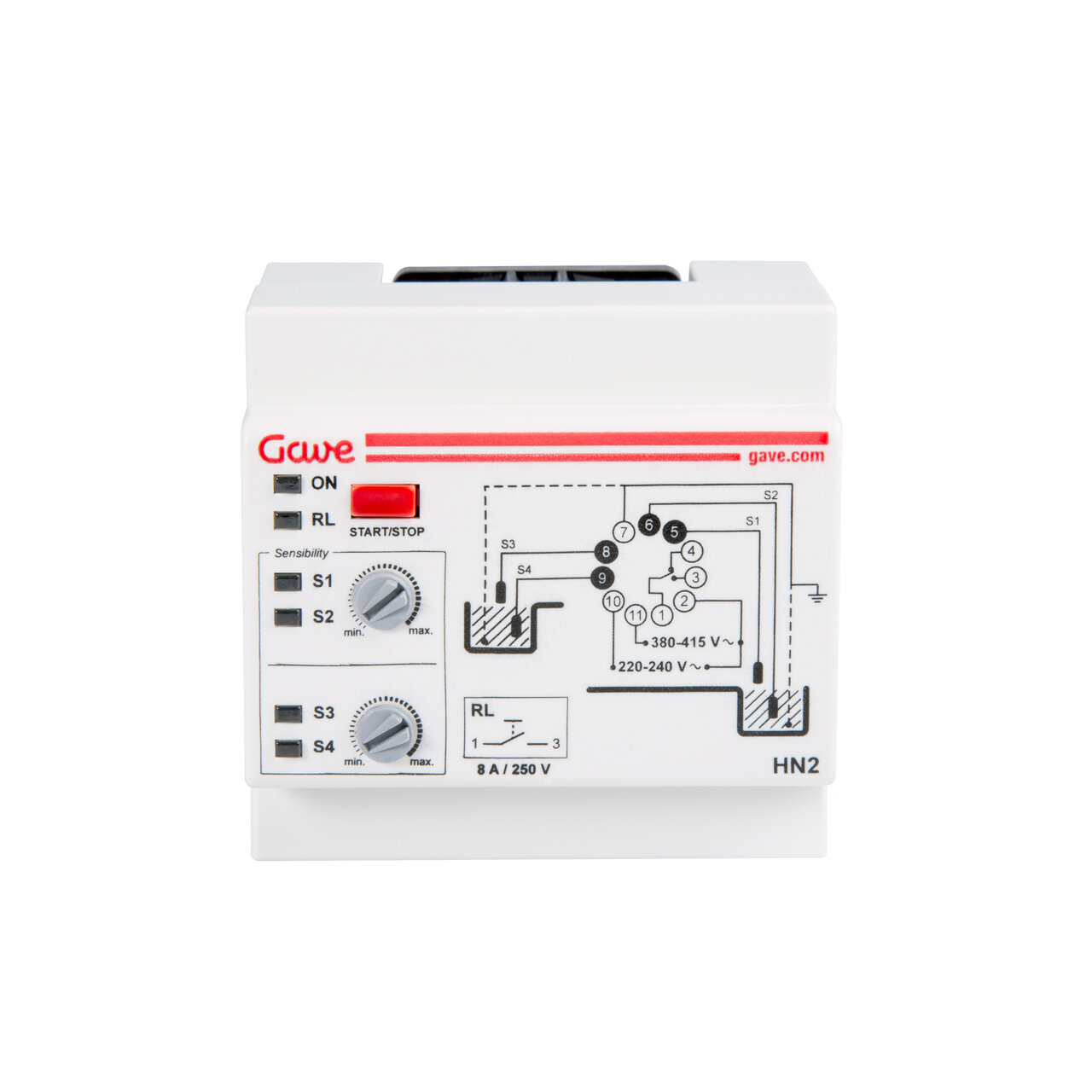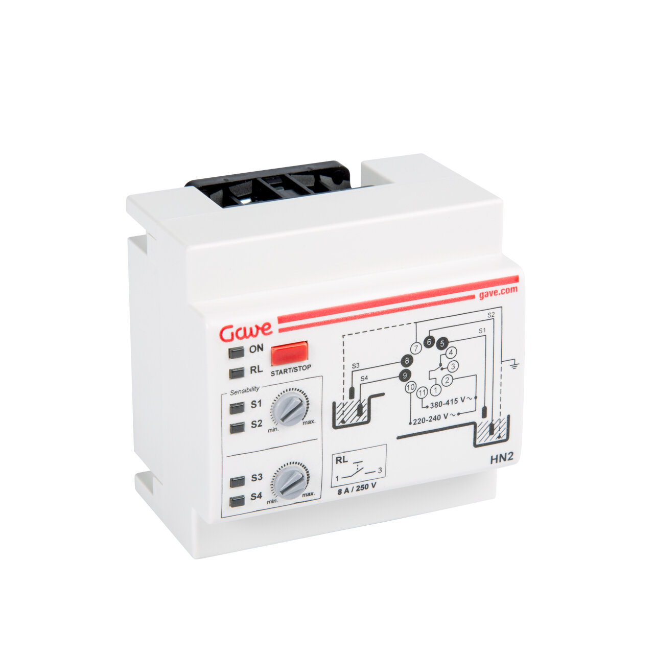 Interruptor de nivel doble para pozo y depósito enchufable sobre base undecal. Entregado con sondas y base. Bitensión 230/400 V AC. Montaje sobre perfil DIN o sobre panel. Ancho 4 módulos (70 mm). Consumo 2,5 VA. Poder de corte contactos salida 8 A/250 V AC cosφ=1. Sensibilidad ajustable. Indicación LED de las sondas de nivel. Función Start/Stop. Función OVR/Test.
