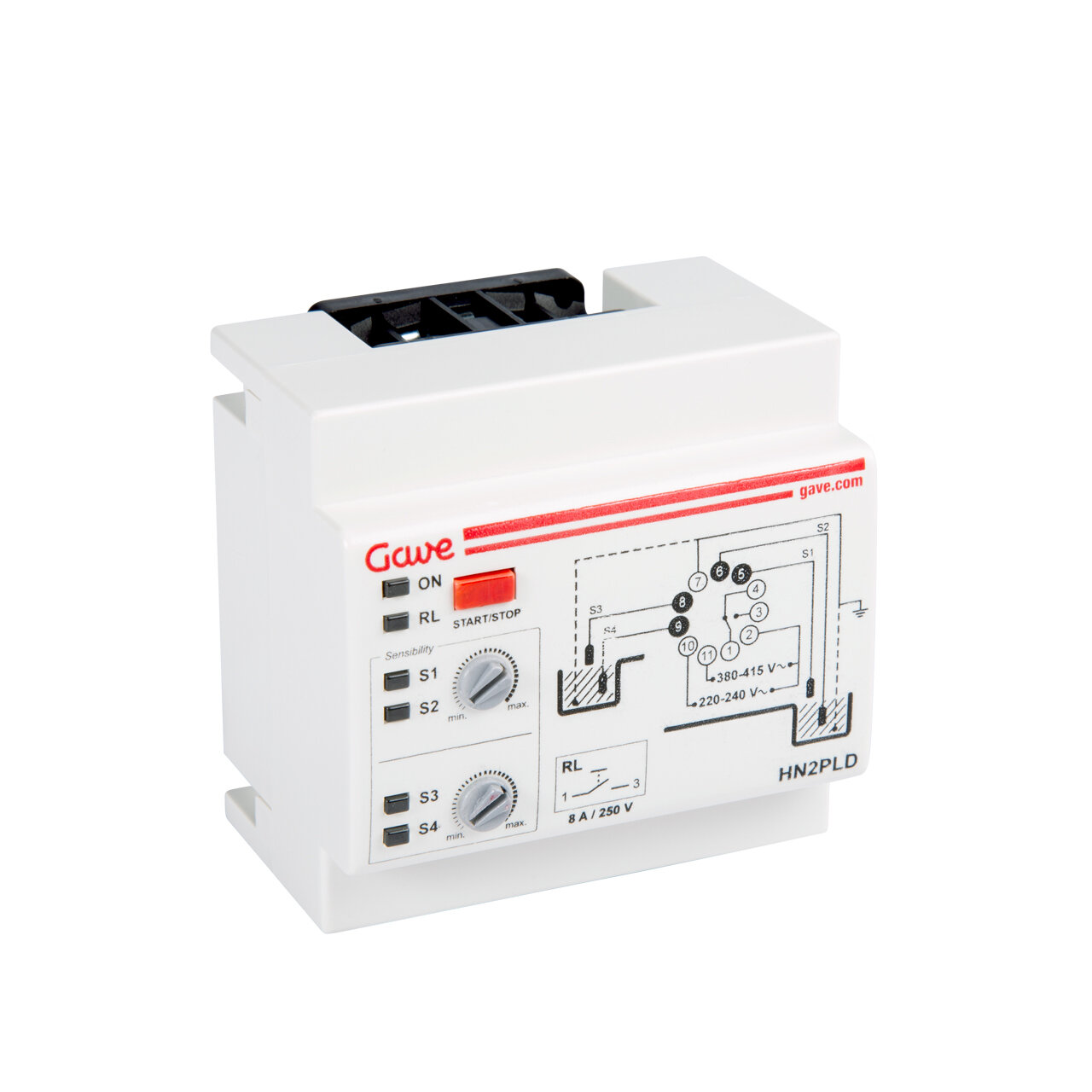 Interruptor de nivel doble de largas distancias para pozo y depósito, enchufable sobre base undecal. Versión protegida a 2500 V cresta, tanto la entrada de la alimentación como la entrada de las sondas (equivalente a las perturbaciones producidas por la caída de un rayo en la red). Entregado con sondas y base. Bitensión 230/400 VAC. Montaje sobre perfil DIN o sobre panel. Ancho 4 módulos (70 mm). Consumo 2,5 VA. Poder de corte contactos salida 8 A/250 VAC cosφ=1. Sensibilidad ajustable. Indicación LED de las sondas de nivel. Función Start/Stop. Función OVR/Test.