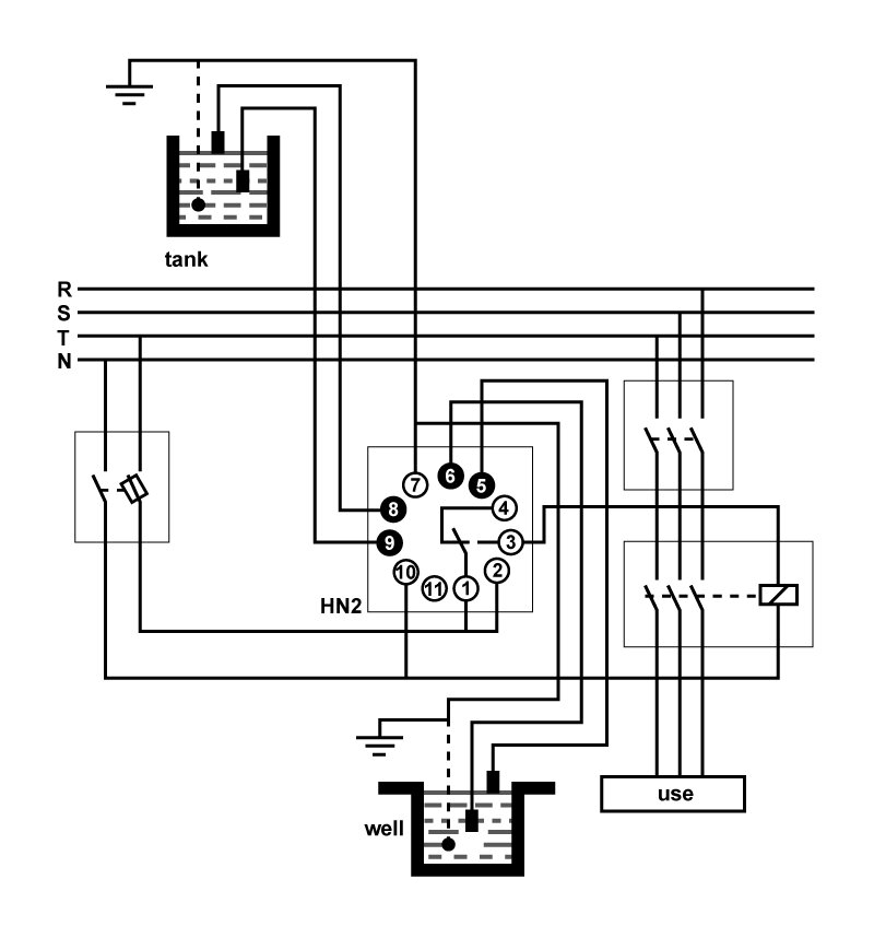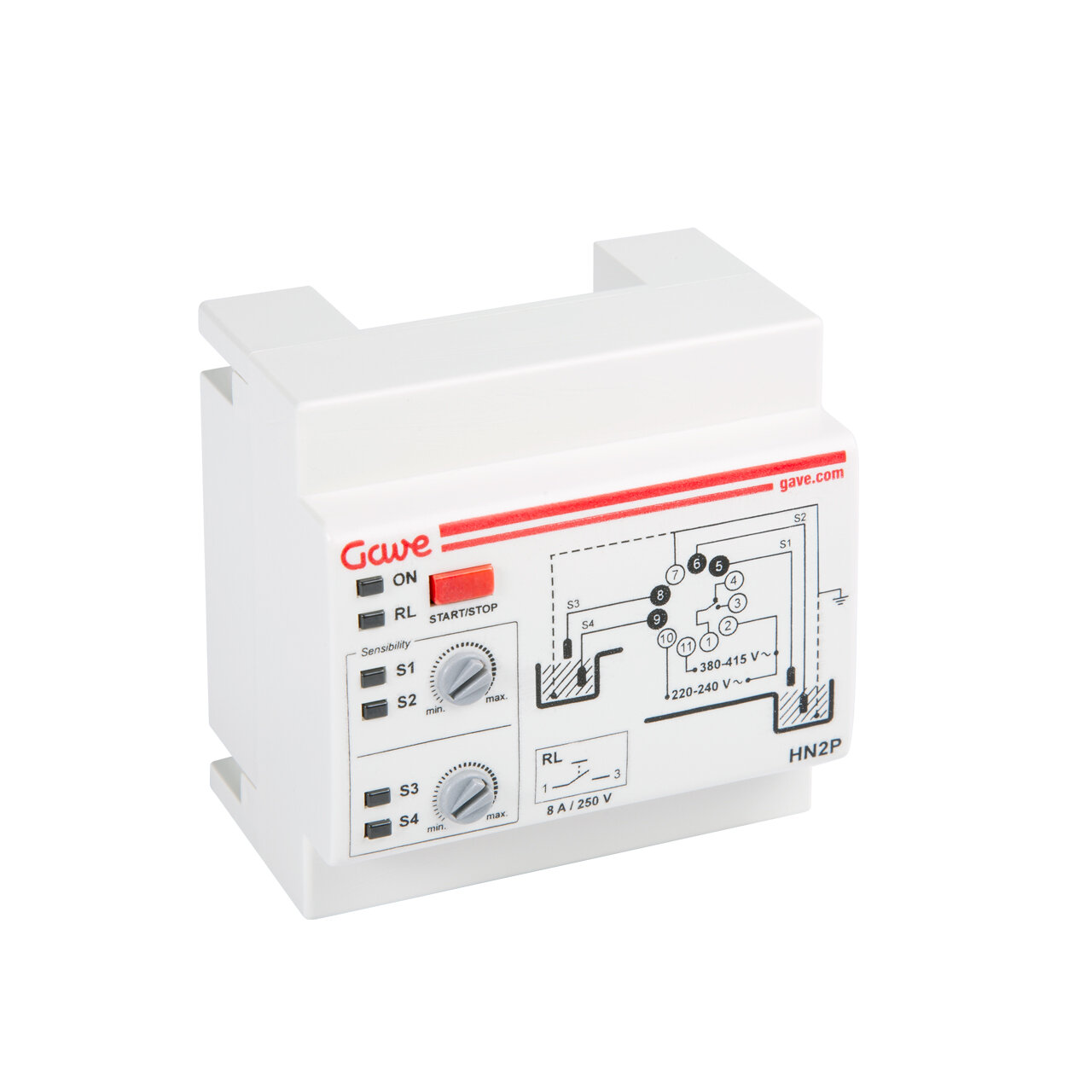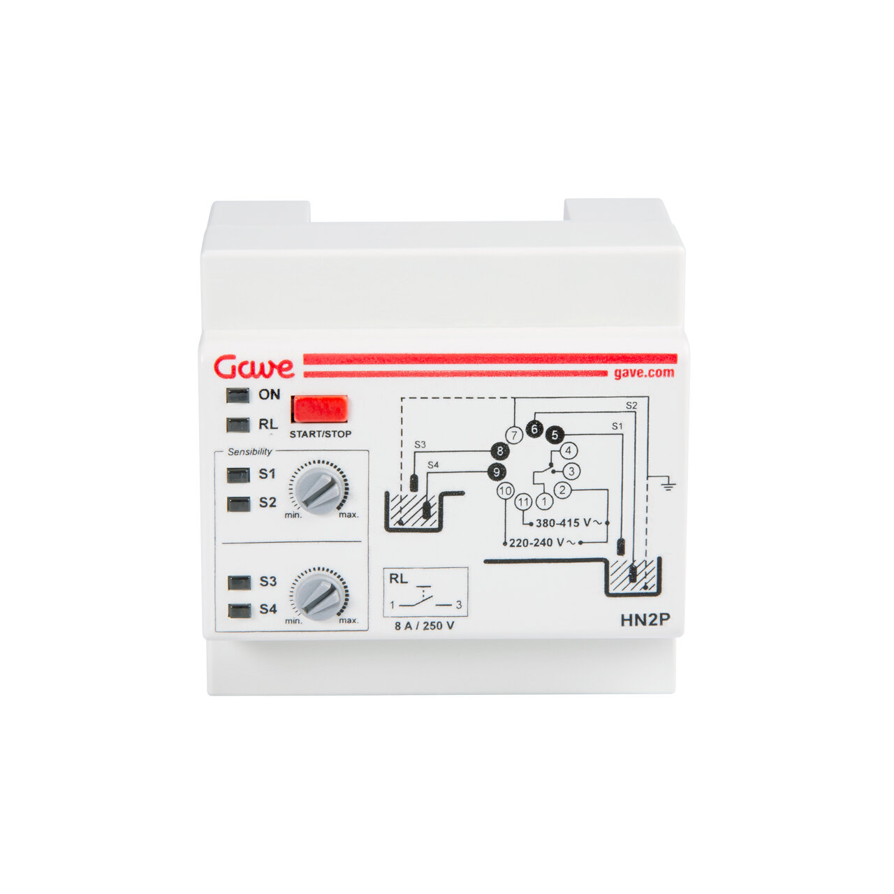 Interruptor de nivel doble para pozo y depósito enchufable sobre base undecal. Versión protegida a 2500 V cresta, tanto la entrada de la alimentación como la entrada de las sondas (equivalente a las perturbaciones producidas por la caída de un rayo en la red). Bitensión 230/400 V AC. Montaje sobre perfil DIN o sobre panel. Ancho 4 módulos (70 mm). Consumo 2,5 VA. Poder de corte contactos salida 8 A/250 V AC cosφ=1. Sensibilidad ajustable. Indicación LED de las sondas de nivel. Función Start/Stop. Función OVR/Test.